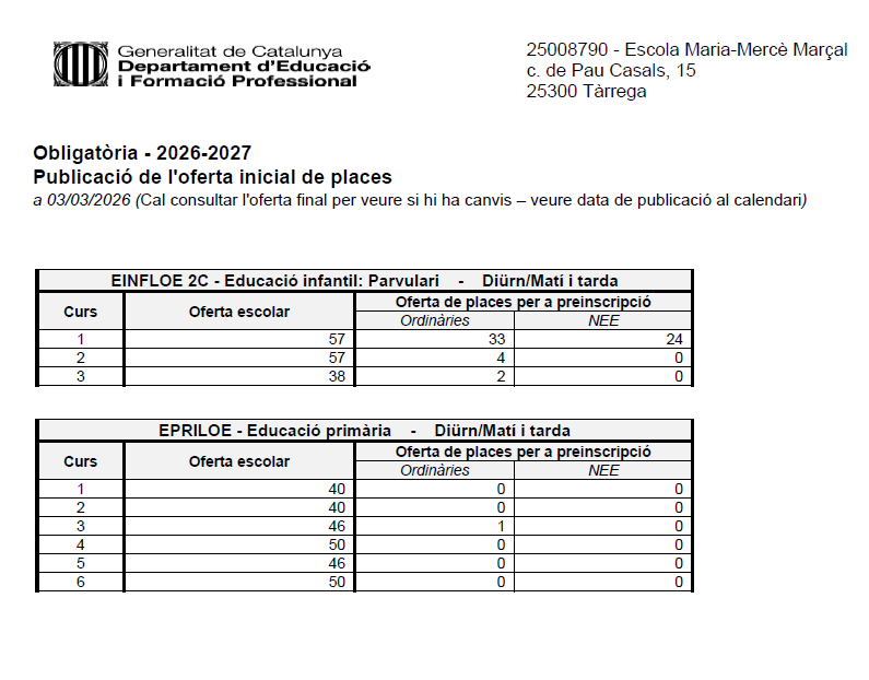 S’ha publicat l’oferta inicial de places vacants pel curs 2026-2027. El termini de preinscripció comença el dia 4 de març i finalitza el dia 18 de març. Podeu trobar tota la informació aquí.
