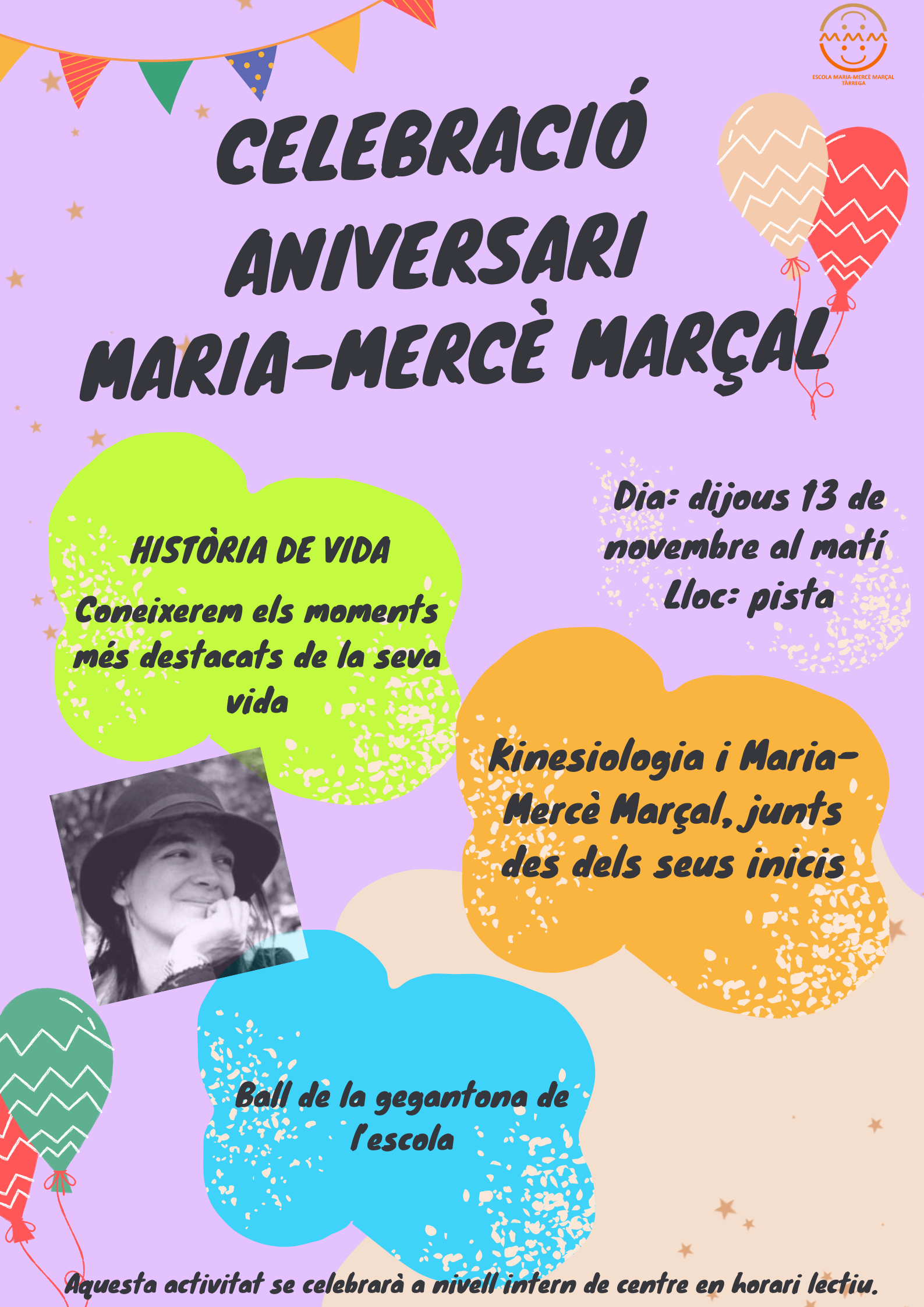 Aquest proper dijous 13 de novembre celebrem l’aniversari de la poetessa Maria-Mercè Marçal. L’alumnat del centre ha organitzat diverses activitats a la pista per a commemorar-ho: història de la seva vida, kinesiologia i ball de la gegantona.