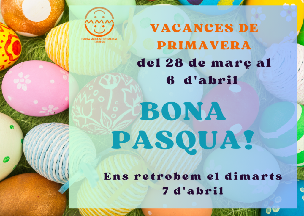 Us informem del període de vacances que iniciem aquest proper 28 de març i que finalitzarà el dilluns 6 d’abril. Ens retrobem el dimarts 7 d’abril.