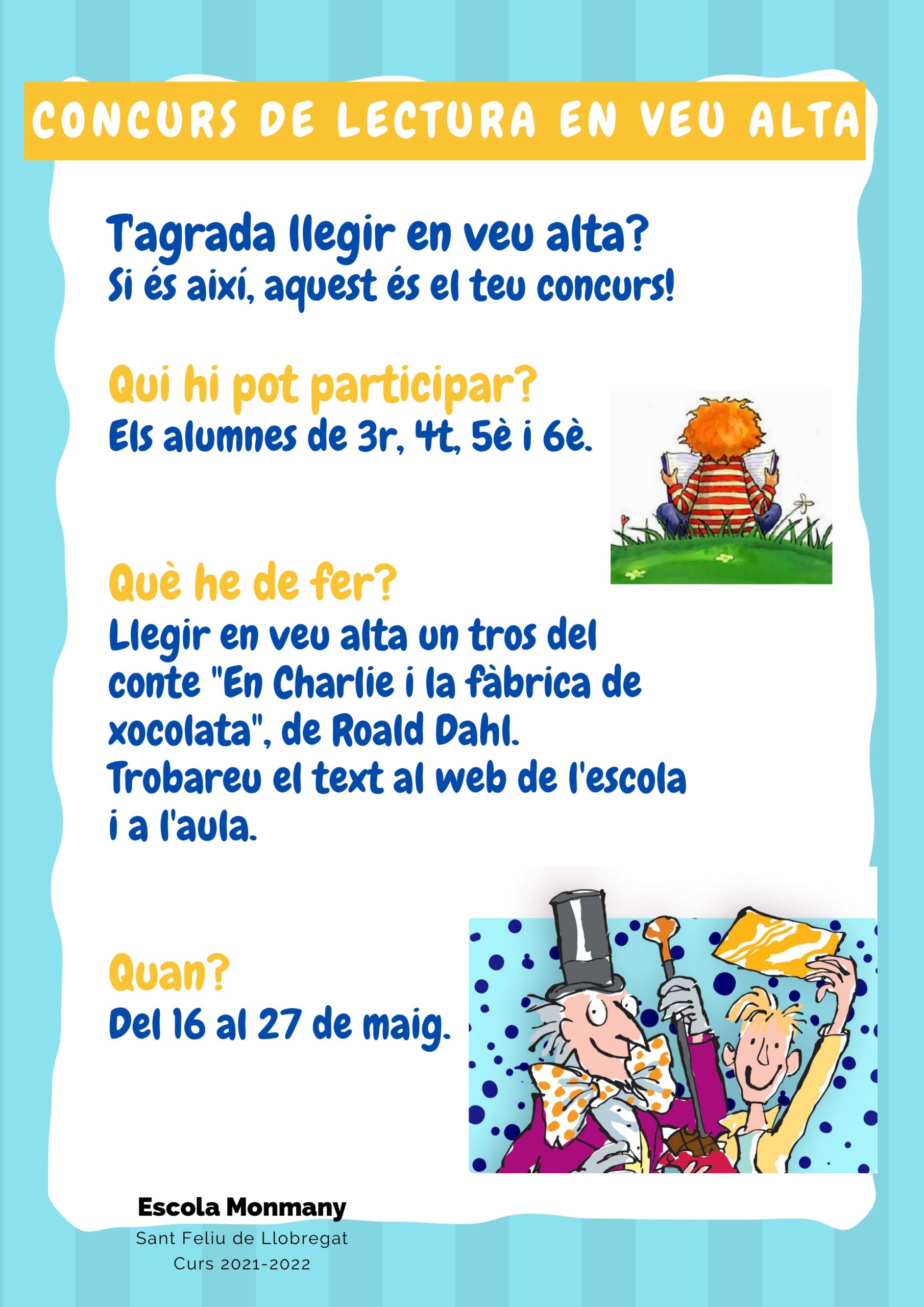 Com veieu al cartell del concurs, els participants llegiran un fragment del llibre “En Charlie i la fàbrica de xocolata”, de Roald Dahl.