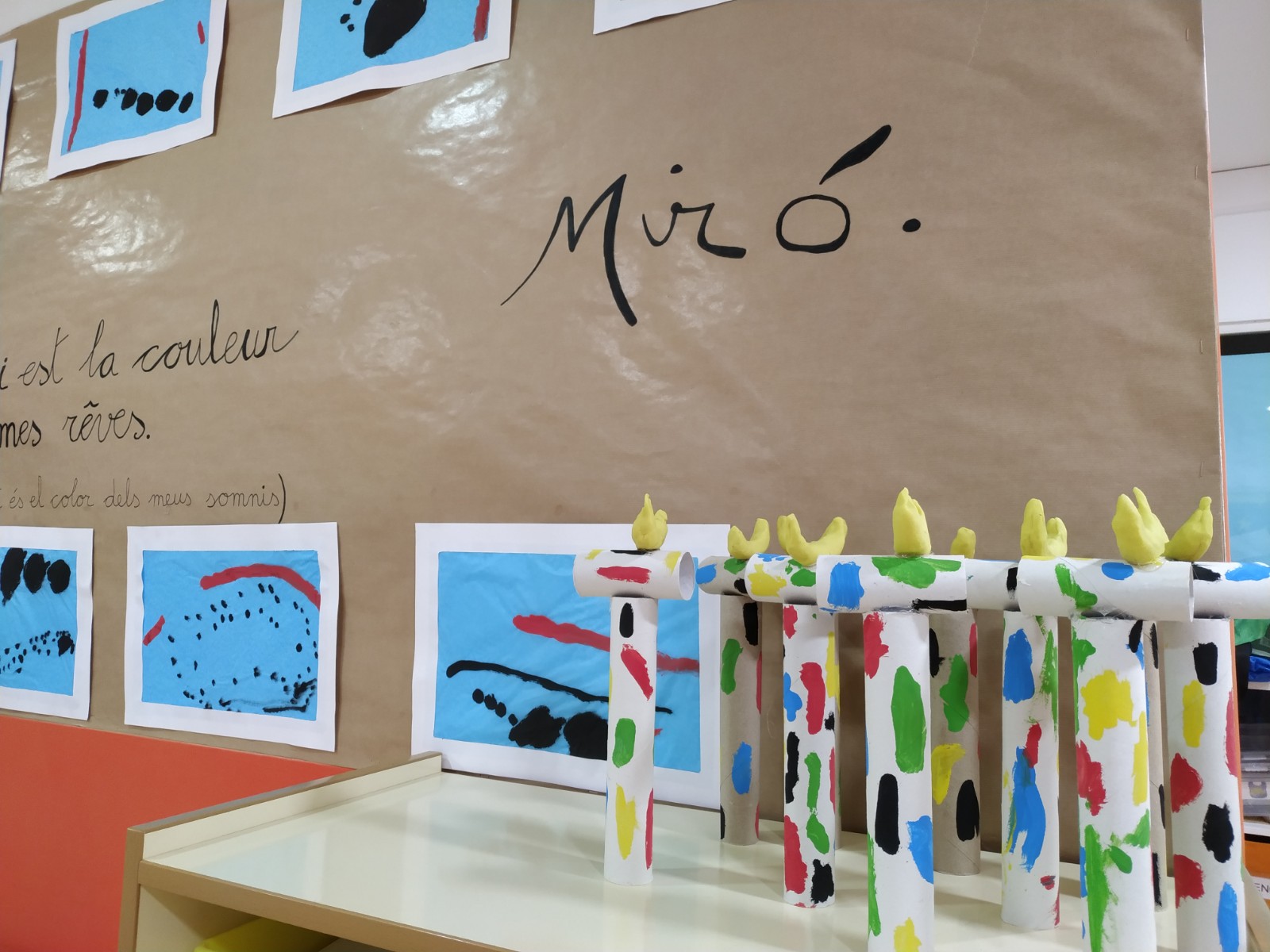 Hem acabat de treballar en Joan Miró i hem fet una gran exposició amb les nostres feines i algunes de P4 i P5 al hall de l’escola. Us ensenyem la darrera plàstica, l’escultura de la dona i l’ocell i l’exposició i us deixem l’enllaç a la sèrie dels Mironins, que als nens els agrada molt!