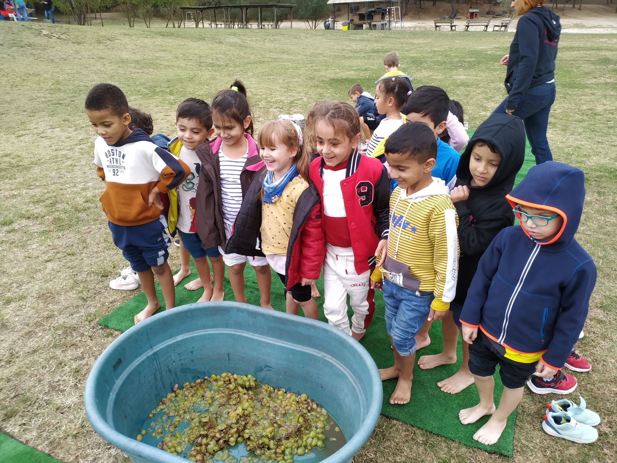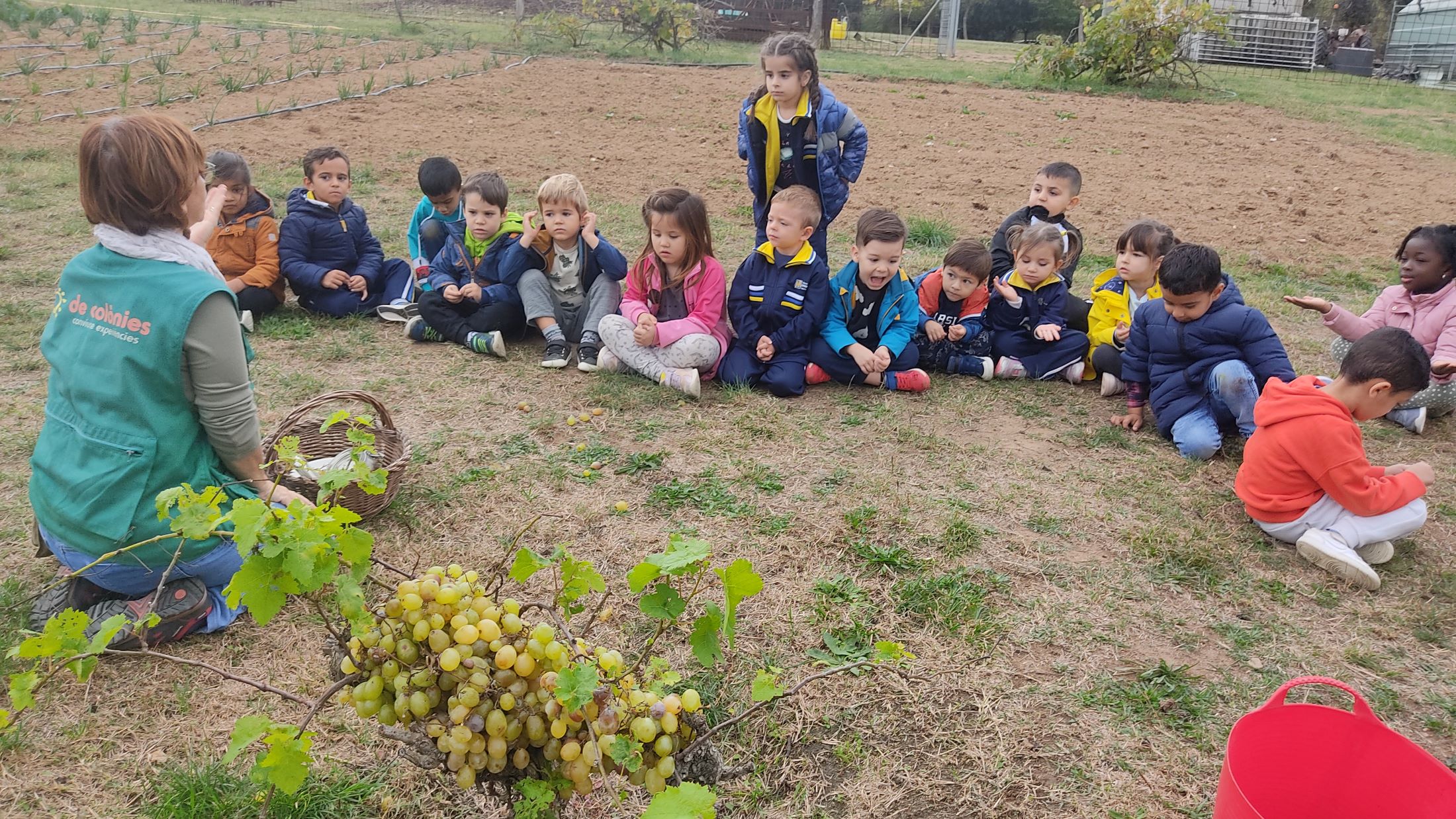 Dijous passat els Bastoners i les Bastoneres i els Llops i les Llobes vam anar al Xaragall, a Llinars del Vallès per fer la verema. Vam realitzar tot el procés, des de recollir el raïm als ceps, passar-lo per la rapadora per treure les branques, xafar-lo amb els peus com es feia antigament i finalment filtrar i embotellar el most. I tastar-lo, tot i que no el que vam fer nosaltres, que el guardem a classe per anar observant com es va produint la fermentació.Va ser un dia molt emocionant, tot i que va ploure una estona però això també ens va permetre veure l’arc de Sant Martí. Desprès del dinar, com que també és una granja, vam veure i alimentar els animals i n’hi havia molts i de totes classes, fins i tot daines!