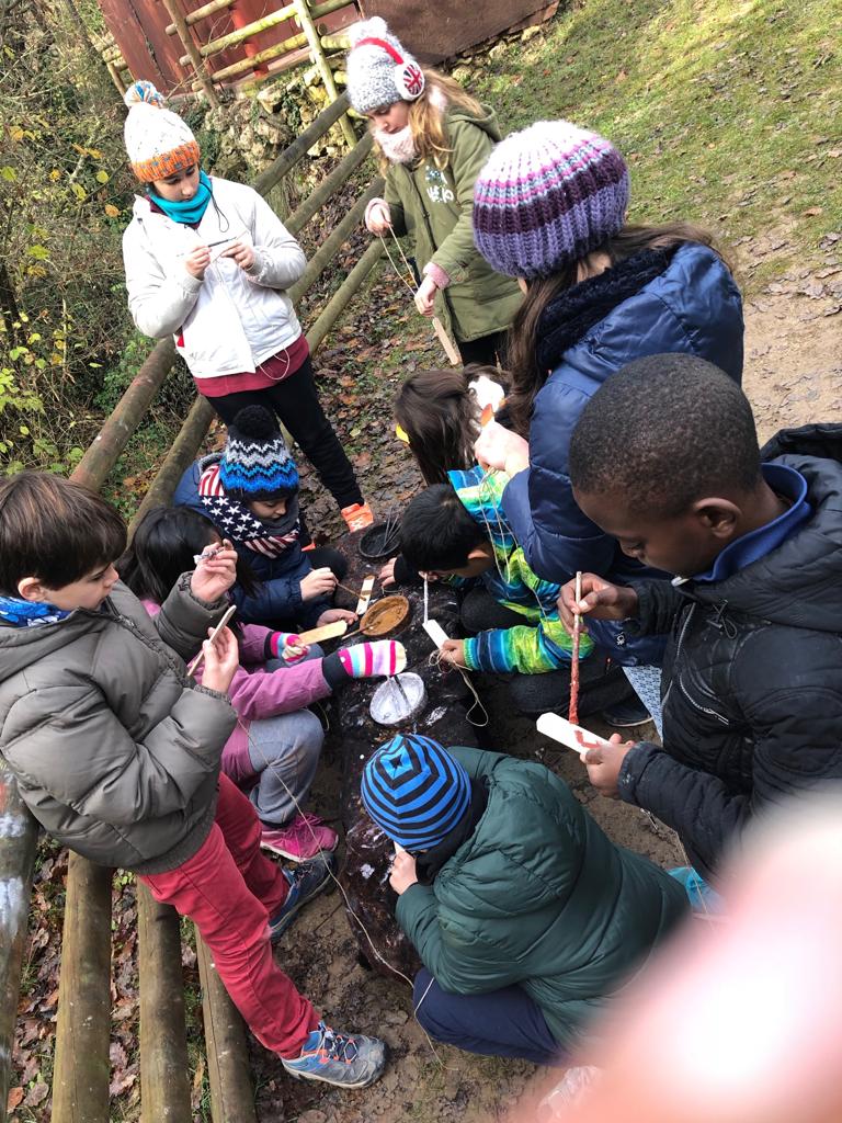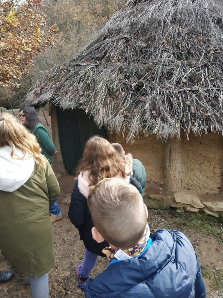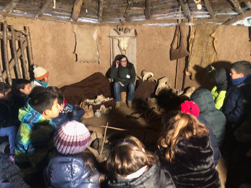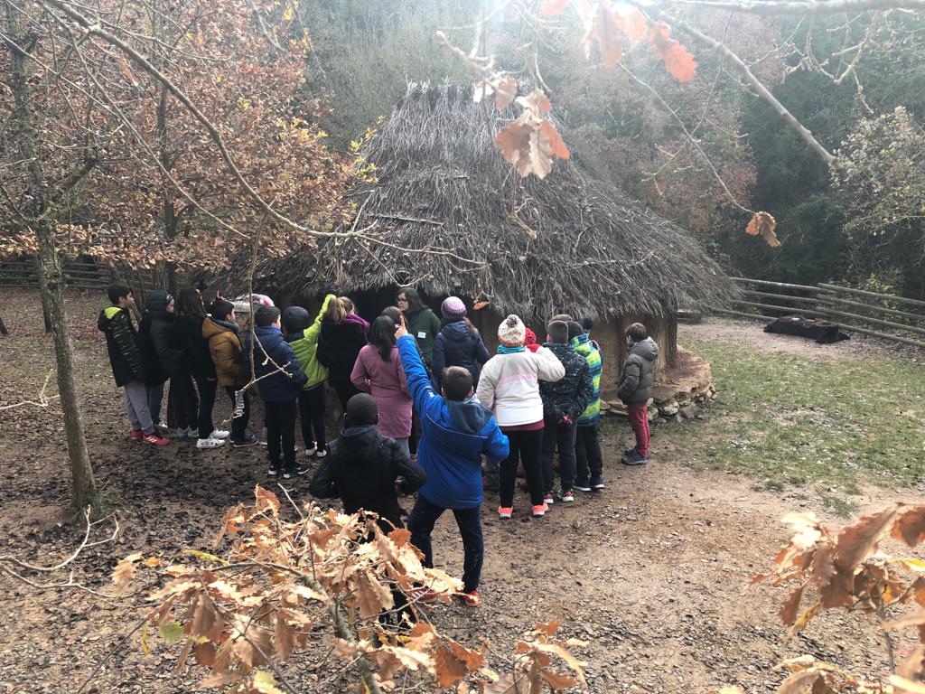 Els alumnes han visitat les cabanes i, gràcies a totes les reproduccions arqueològiques, han pogut imaginar-se com vivien a la Prehistòria. Quines espècies d’humans vivien? Com vivien? Com fabricaven les seves eines? Com encenien foc?. També per saber com es comunicaven han realitzat el taller del “Brunzidor”. Han observat que al fer voltar el “brunzidor” aquest emetia un brunzit audible a centenars de metres de distància i així es podien comunicar. Els nens i nenes ho han polit utilitzant pedres sorrenques i l’han decorat amb pigments naturals.