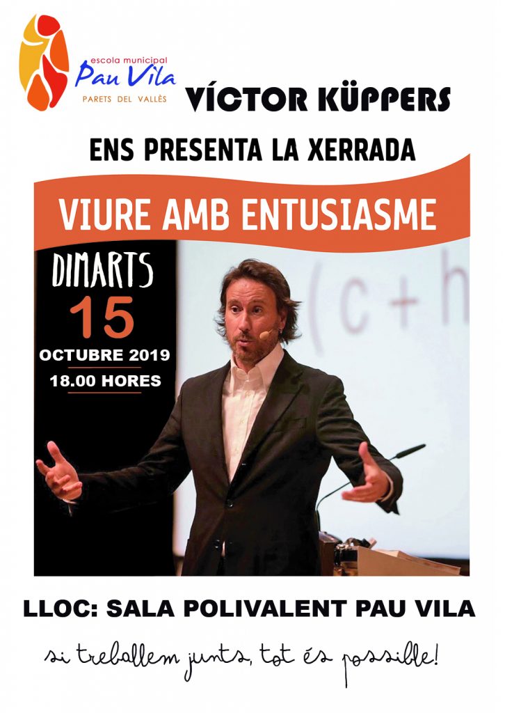 Per motius laborals i canvis en l’agenda de Víctor Küppers, la xerrada prevista pel dilluns 14 d’octubre a l’escola queda ajornada per l’endemà, dimarts 15 d’octubre a la mateixa hora. Us demanem comprensió en aquest canvi ja que el ponent, de reconegut prestigi professional, vindrà a l’escola Pau Vila de forma altruista. Totes les inscripcions que es van fer anteriorment continuen vigents i tenen la mateixa validesa. Demanem disculpes si alguna família es va apuntar pel dia 14 i ara no pot venir. En aquest cas, preguem que ens envieu un mail a xerradespauvila@gmail.com dient que us és impossible assistir a la xerrada. Si pel contrari, no us vau apuntar i la nova data us va bé, us convidem a fer la inscripció (està activa a la web).