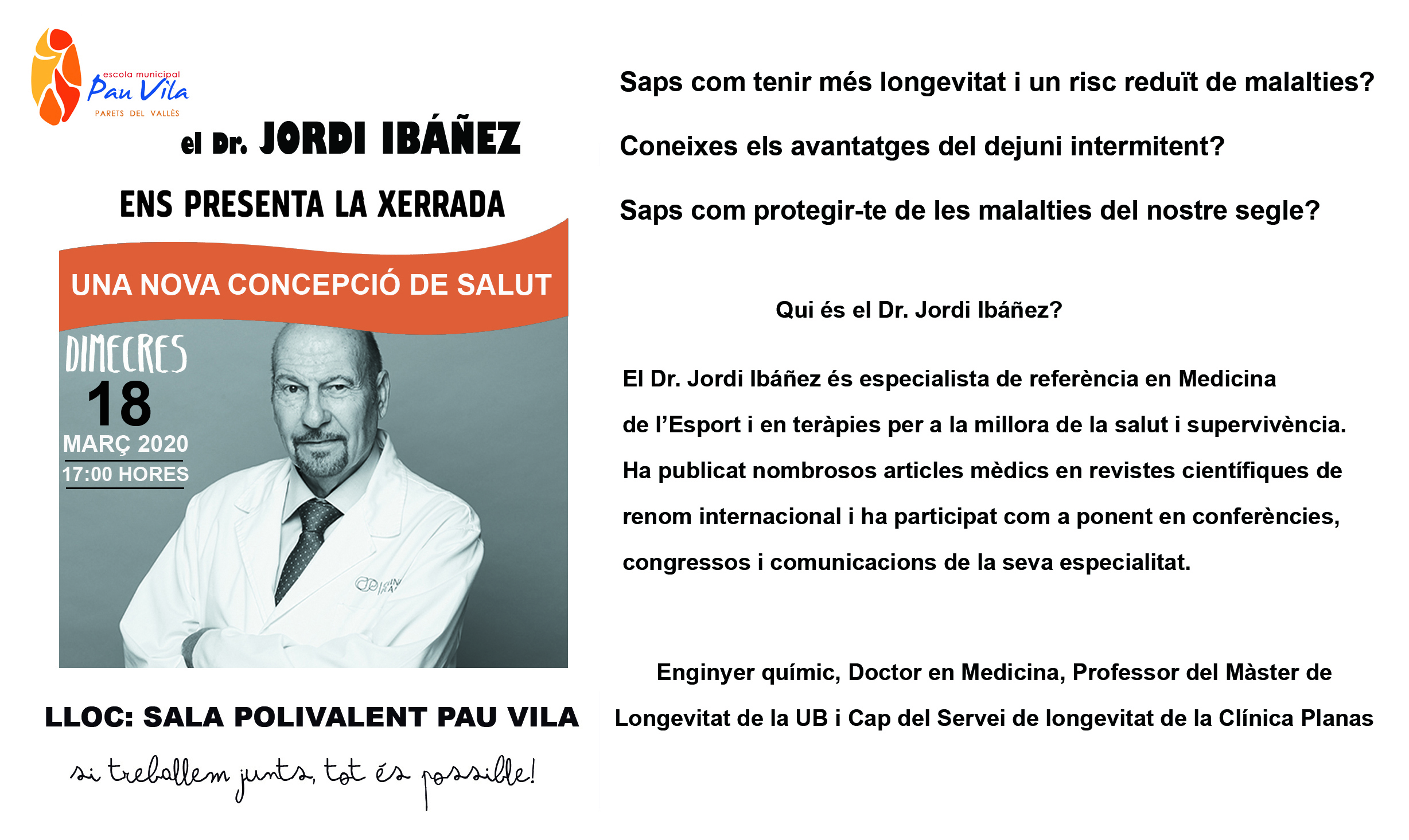 Aquest curs escolar el tema central que treballem amb l’alumnat és l’esport i els jocs olímpics. Per tal de fer extensiu aquest tema a les famílies proposem la xerrada d’en Jordi Ibáñez, especialista en Medicina de l’esport i en teràpies per a la millora de la salut i la supervivència. Creiem que aporta una mirada interessant envers la salut.