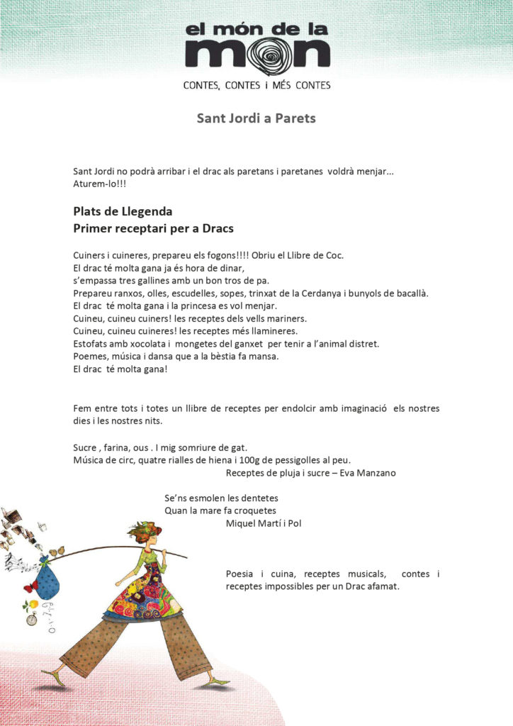 Per poder gestionar aquesta situació avui ens han visitat dos especialistes en nutrició de dracs, la Patrícia McGill i en Santi Rovira i ens han explicat què hem de fer perquè no ens mengi als habitants de Parets: Receptes familiars, especials, amb ingredients possibles i impossibles, plenes d’imaginació, paraules poètiques i músiques encisadores.