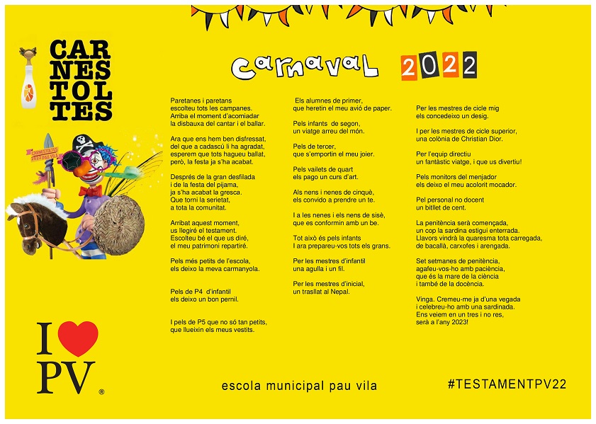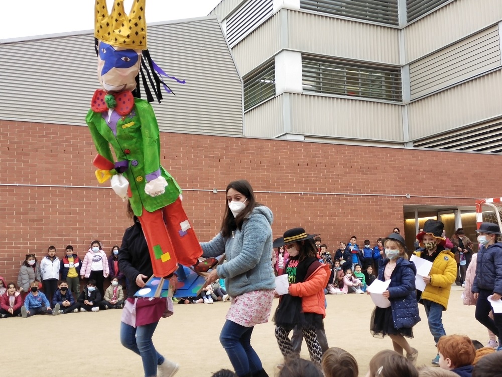 El Rei Carnestoltes ha presidit el carnaval i ha representat l’ambient de disbauxa de la nostra escola. Avui, dimecres de cendra, ha sigut jutjat pel seu mal comportament i condemnat a mort. Després de llegir el testament, sempre impregnat de missatges per les classes, s’ha cremat en el pati. Tot seguit alumnes de 1r han procedit a fer l’enterrament de la sardina. D’aquesta manera es representa el final del perÃode de carnaval i l’inici de la Quaresma, set setmanes presidides per l’austeritat i l’abstinència. Finalment ha fet l’entrada al pati la Vella Quaresma, aquella velleta amb set cames que va perdent d’una en una a mesura que van passant les setmanes.