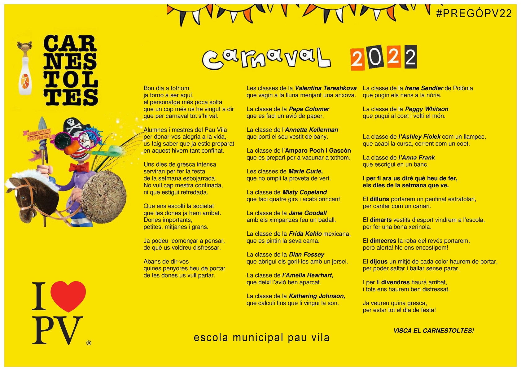 Pregó del Rei Carnestoltes admin18/02/22 Avui els nens i les nenes de Cicle Inicial han fet la lectura del pregó del Rei Carnestoltes. Ens han explicat amb rodolins els manaments que la propera setmana ens acompanyaran. Tot seguit els alumnes han ballat i jugat a la pista de l’escola.