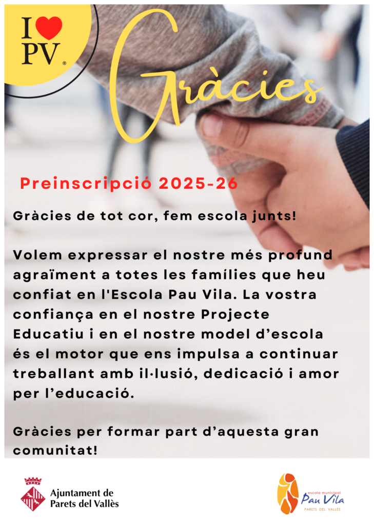 Volem expressar el nostre més profund agraïment a totes les famílies que heu confiat en l’Escola Pau Vila. La vostra confiança en el nostre projecte educatiu i en el nostre model d’escola és el motor que ens impulsa a continuar treballant amb il·lusió, dedicació i amor per l’educació.