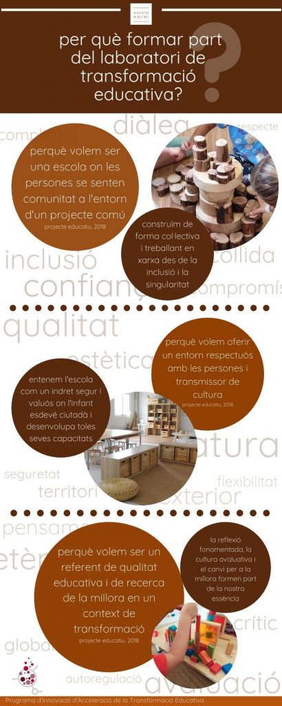 A partir del curs 2020-2021, com a resposta a la petició que ens ha fet el Departament d’Educació, formarem part de l’entorn Laboratori de Transformació educativa juntament amb altres centres de Catalunya com a motor de transformació global del sistema educatiu. Ens il·lusiona aquest nou repte alhora que ens satisfà pel reconeixement que representa del nostre projecte educatiu i la nostra manera de fer. L’equip educatiu comença aquest camí ple de motivació: