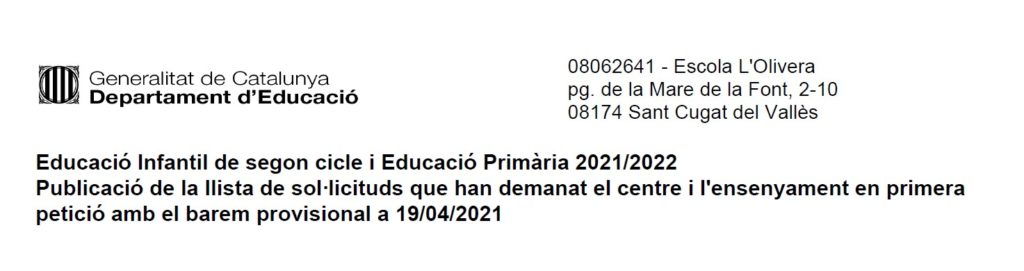 Publicació de la llista de sol·licituds que han demanat el centre i l’ensenyament en primera petició amb el barem provisional a 19/04/2021: