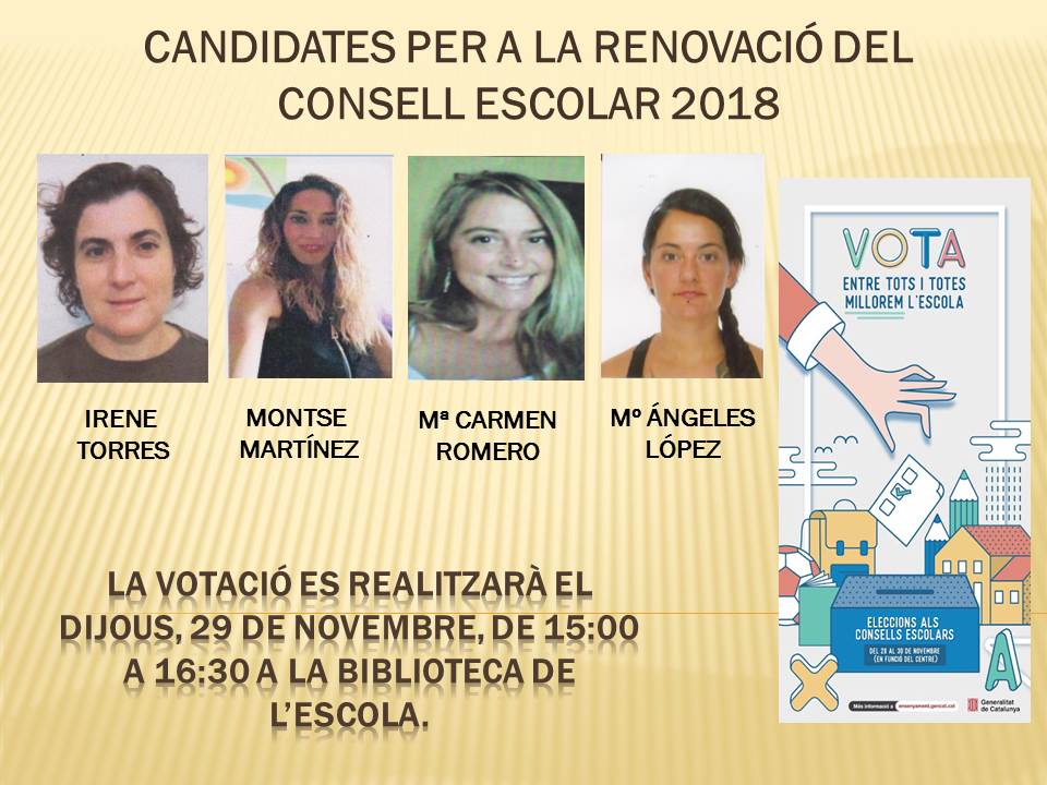Ahir dijous, 29 de novembre, es van realitzar les votacions per escollir les tres vacants que hi han al consell escolar al sector de pares i mares d’alumnes. A arrel d’aquestes votacions han sortit escollides les següents mares: