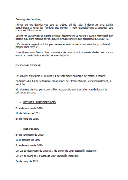 Primer de tot desitjar-vos que us trobeu bé de salut i donar-vos una càlida benvinguda a totes les famílies del centre, i molt especialment a aquelles que s’acaben d’incorporar.