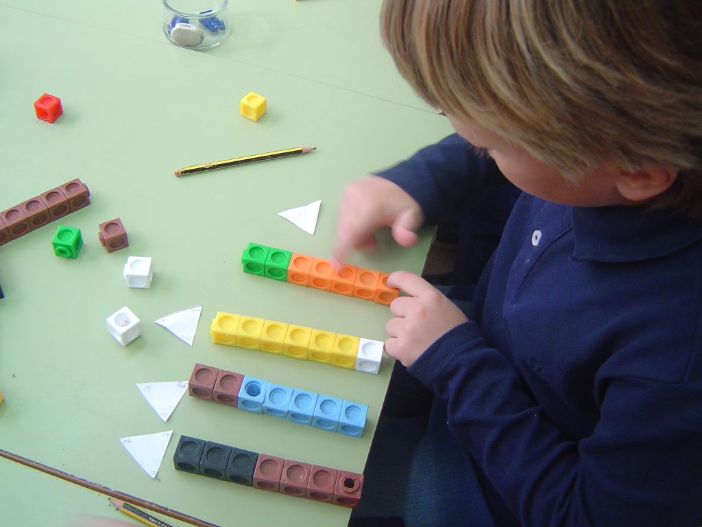 Fem torres de 7 intentant buscar maneres diferents. Després escrivim en un triangle la descomposició. EL triangle additiu ens permet veure a cop d’ull les relacions que s’estableixen entre els nombres (4,3,7 pot ser llegit de moltes maneres: 4+3=7/ 3+4=7/ 7-3=4/ 7-4=3).