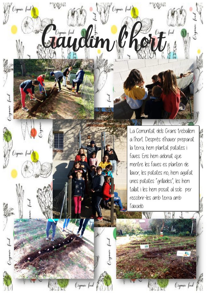 La comunitat dels grans treballem a l’hort. Després d’haver preparat la terra, hem plantat patates i faves. Ens hem adonat que mentre les faves es planten amb llavors i les patates no. Hem agafat unes patates “grillades”, les hem tallat, les hem posat al solc i les hem recobert de terra amb l’aixadó.