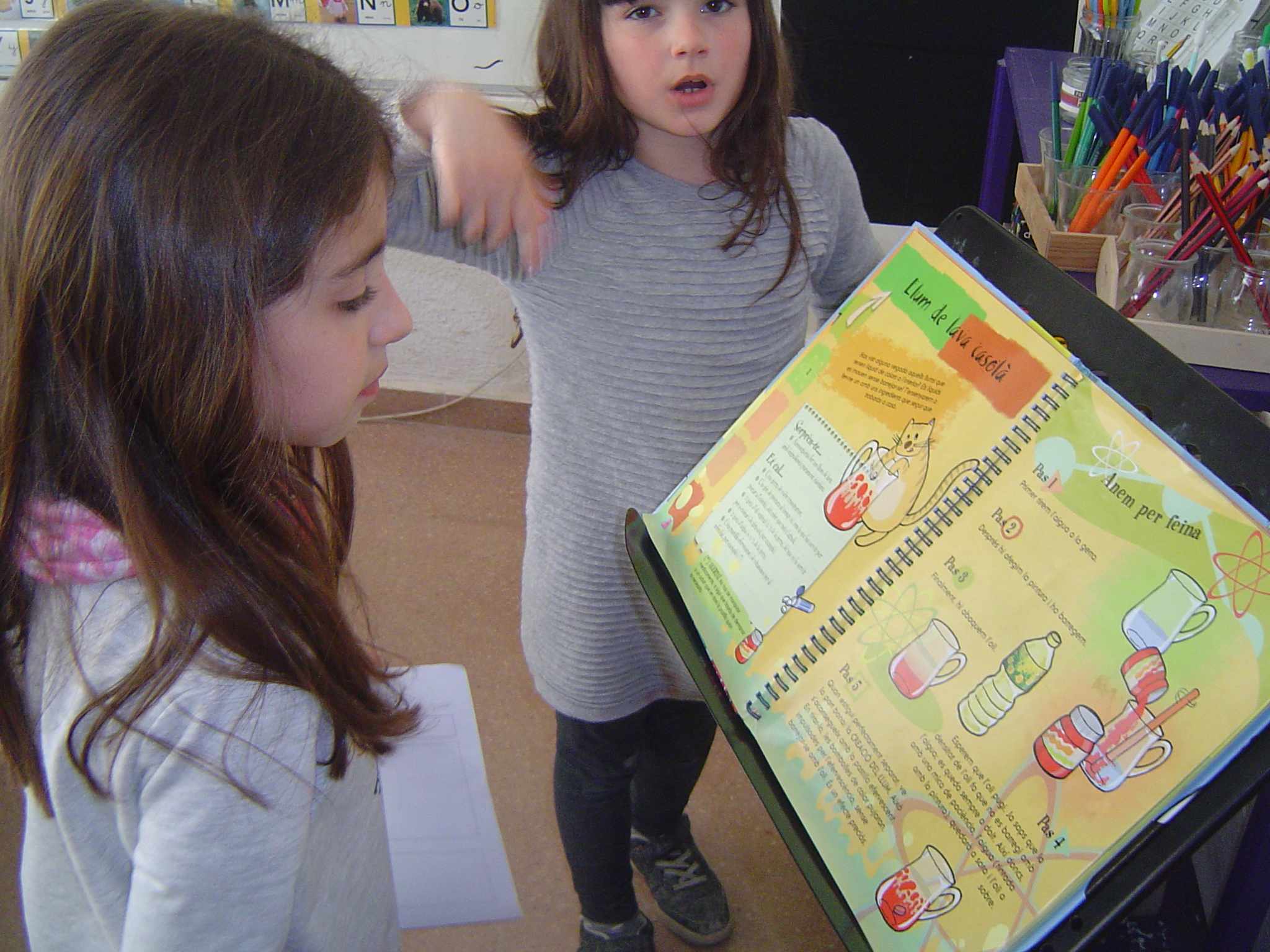 Continuem fent experiments. En aquest últim experiment hem introduït una novetat, a partir d’ara una parella o grup de nens i nenes de primer es prepararan l’explicació de l’experiment prèviament i ells ens l’explicaran el dia que el fem. És una altra manera de llegir amb sentit.