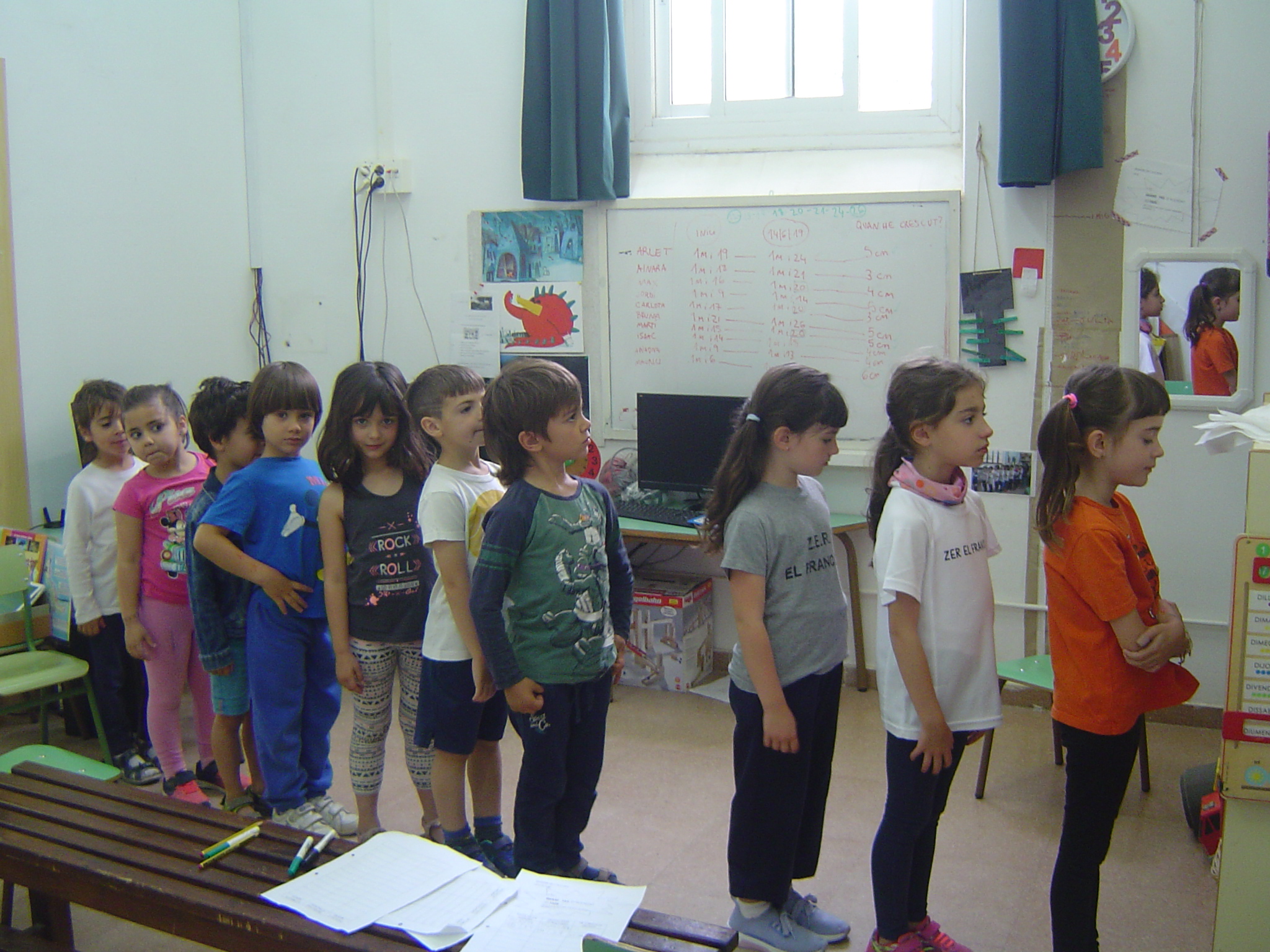 Com ja comença a ser tradició, no podiem acabar el curs sense mesurar l’alçada. L’hem estat registrant en diferents moment del curs. Aquestes dades ens ajuden a reflexionar sobre diferents variables: qui és més alt? Qui és més baix? El més baix a final de curs ja ho era a l’inici? Qui ha crescut més? El més alt és el més gran d’edat?…I així hem estat discutint una bona estona.(Llàstima que aquest dia faltaven dos companys!)