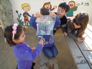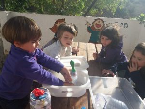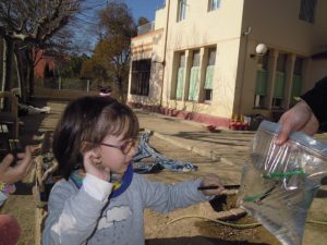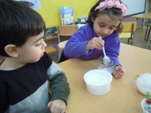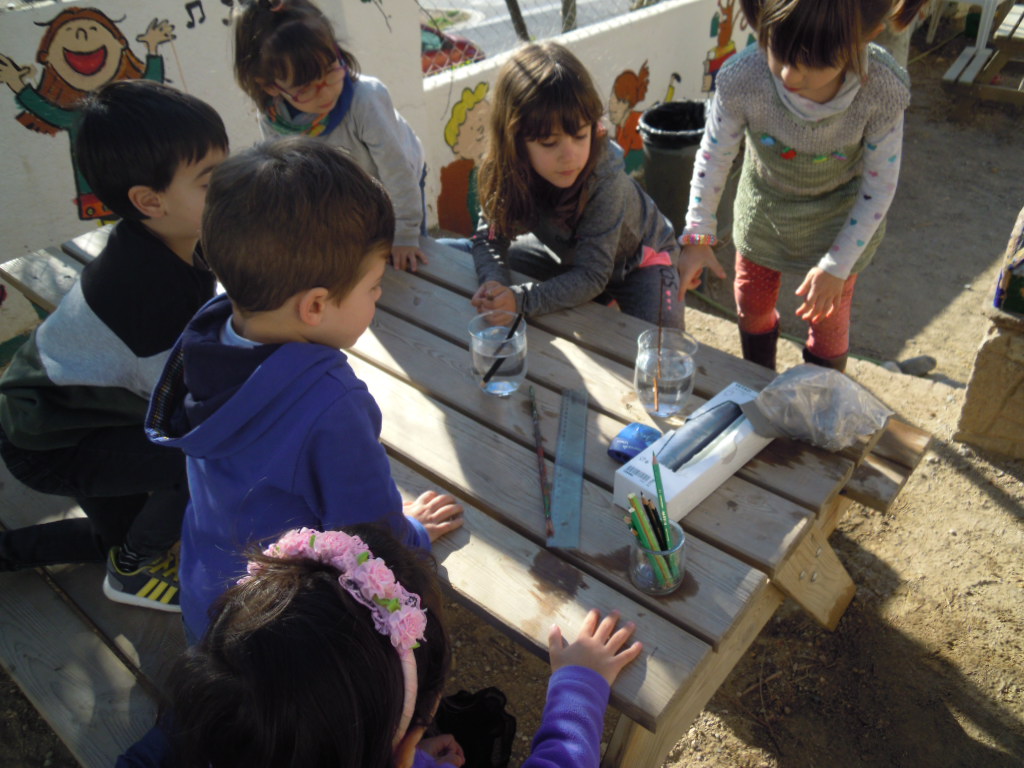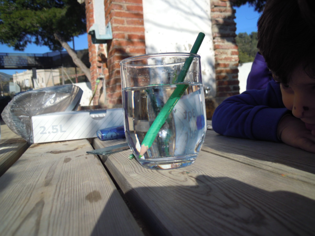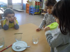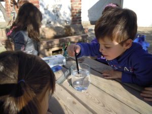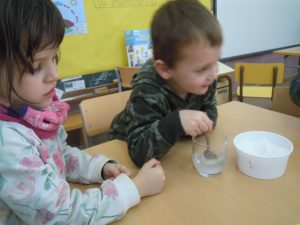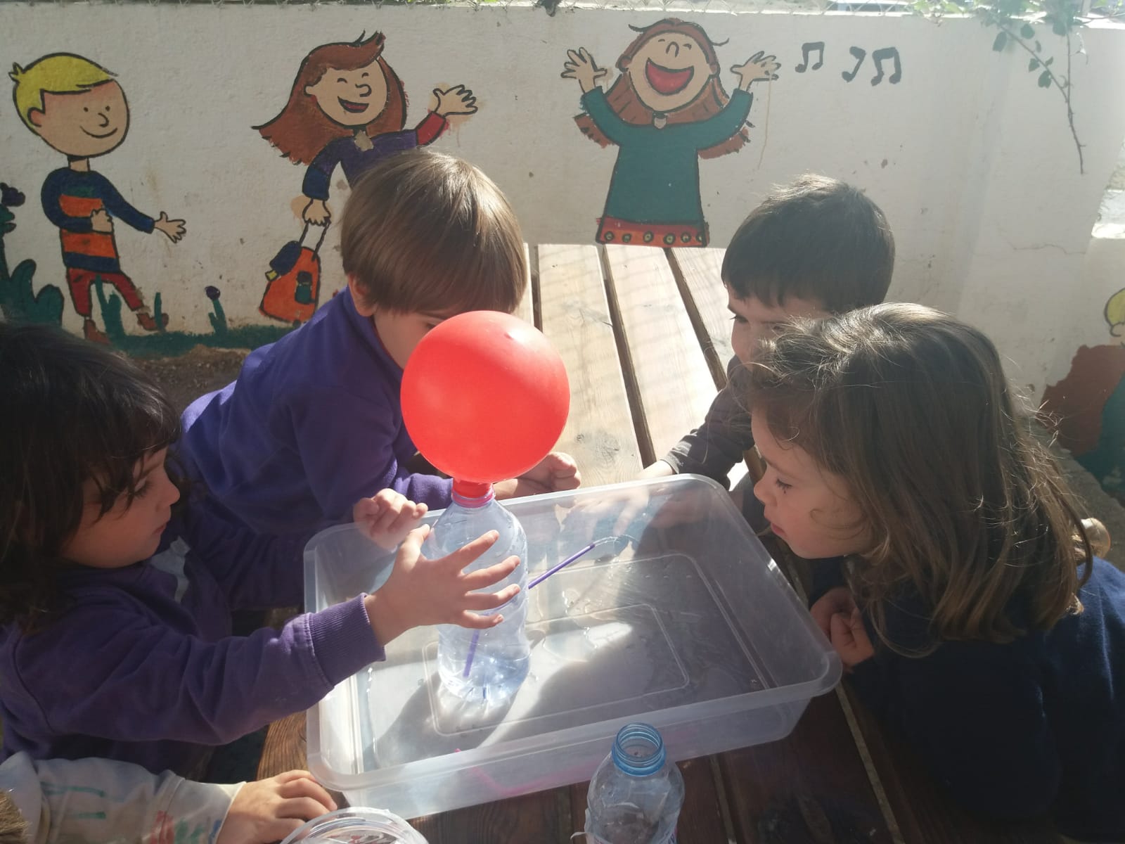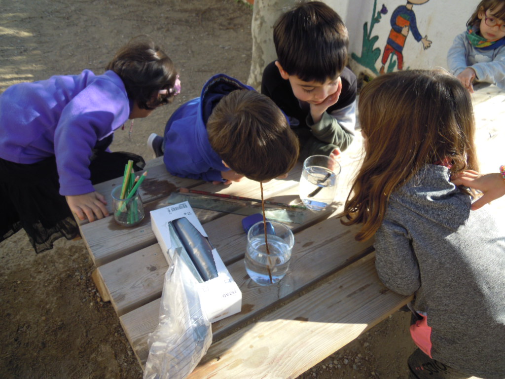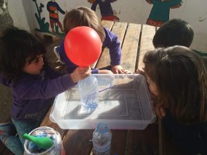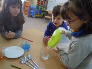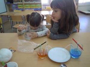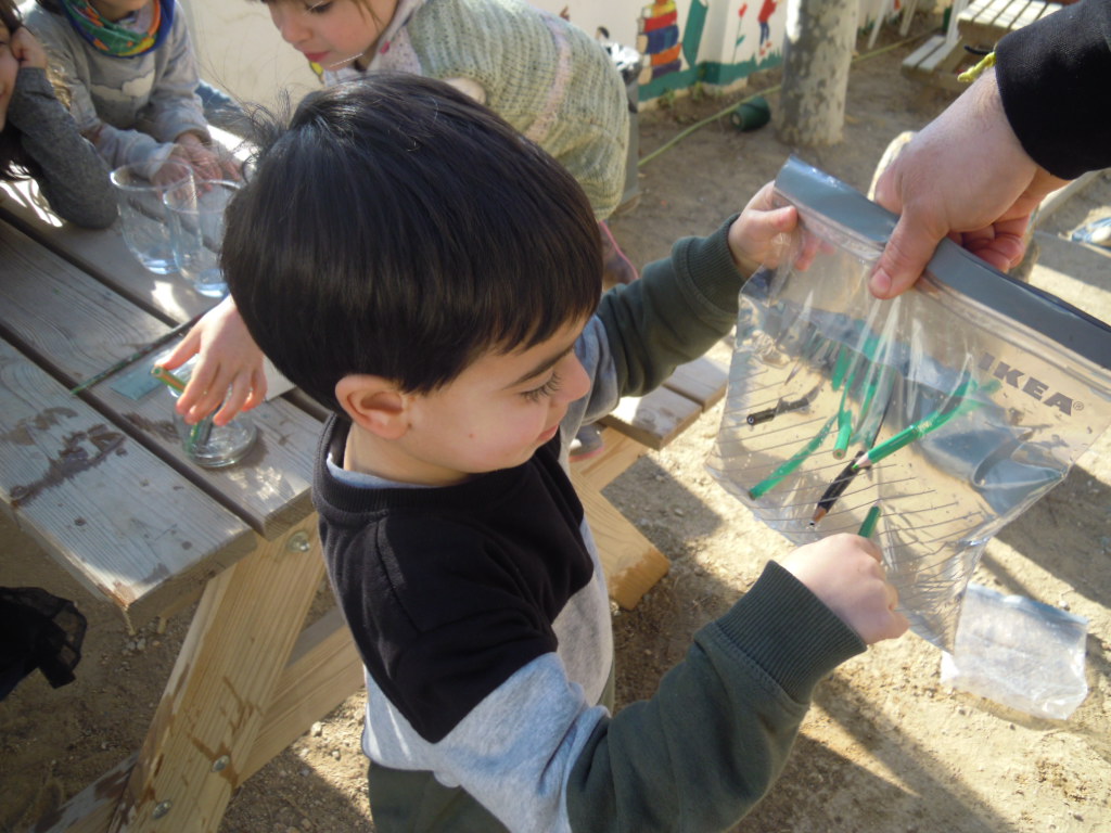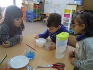 Durant el segon trimestre hem continuat fent experiments relacionats amb el projecte de l’aigua, saturem amb sal per observar com cristal·litza la sal quan s’evapora l’aigua, clavem llapis de colors en una bossa plena d’aigua, observem què passa si posem objectes rectes dins l’aigua, fem una font, inflem i desinflem globus amb aigua calenta i freda…