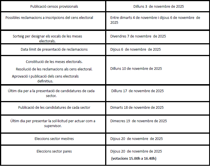 Les eleccions dels/les representants del sector famílies es realitzarà el dia 20/11/25, de 15 a 16.40h al vestíbul de l’escola.