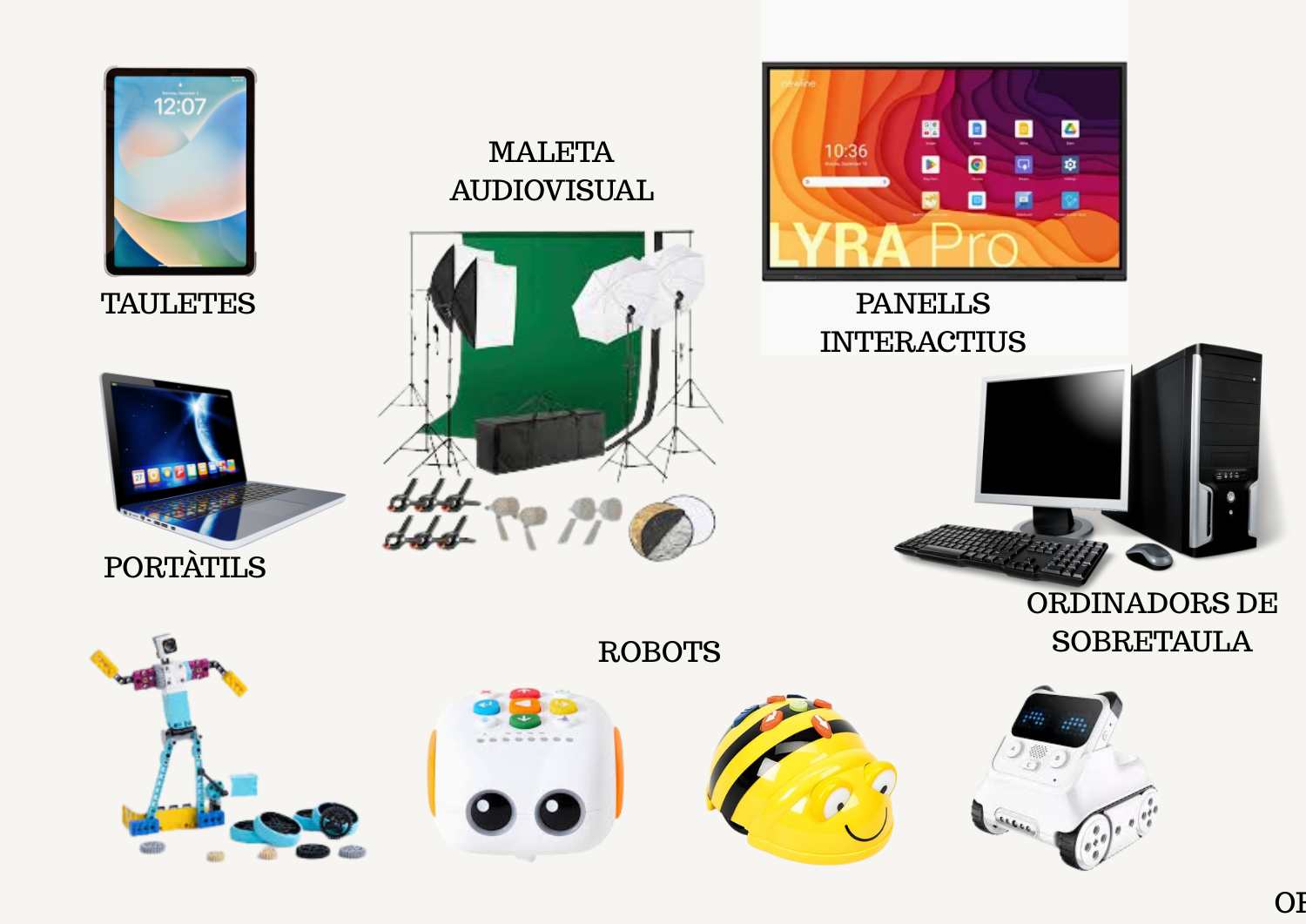 La nostra escola disposa de material informàtic i digital molt variat que permet desenvolupar la tasca docent i potenciar la competència digital del nostre alumnat. Els recursos dels que disposem són: