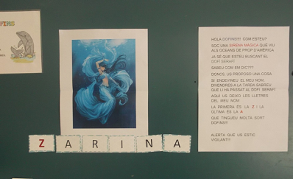 Ahir a la classe dels dofins vam rebre un missatge d’una sirena que viu als oceans d’Amèrica. Vol que endevinem el seu nom. Si ho fem bé aquest divendres a la tarda ens dirà què li ha passat al dofí Serafí. Amb les pistes que ens ha donat ens pensem que es diu ZARINA.
