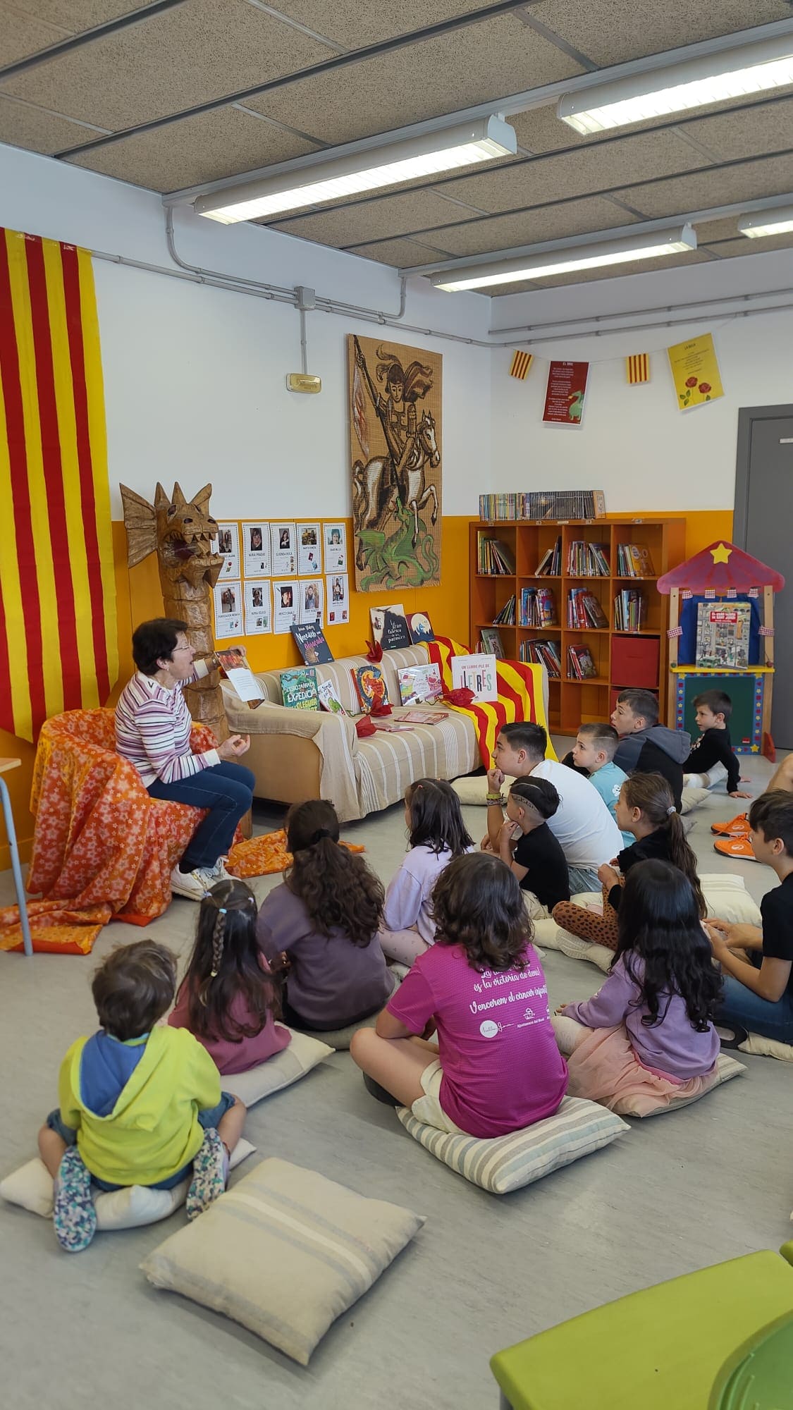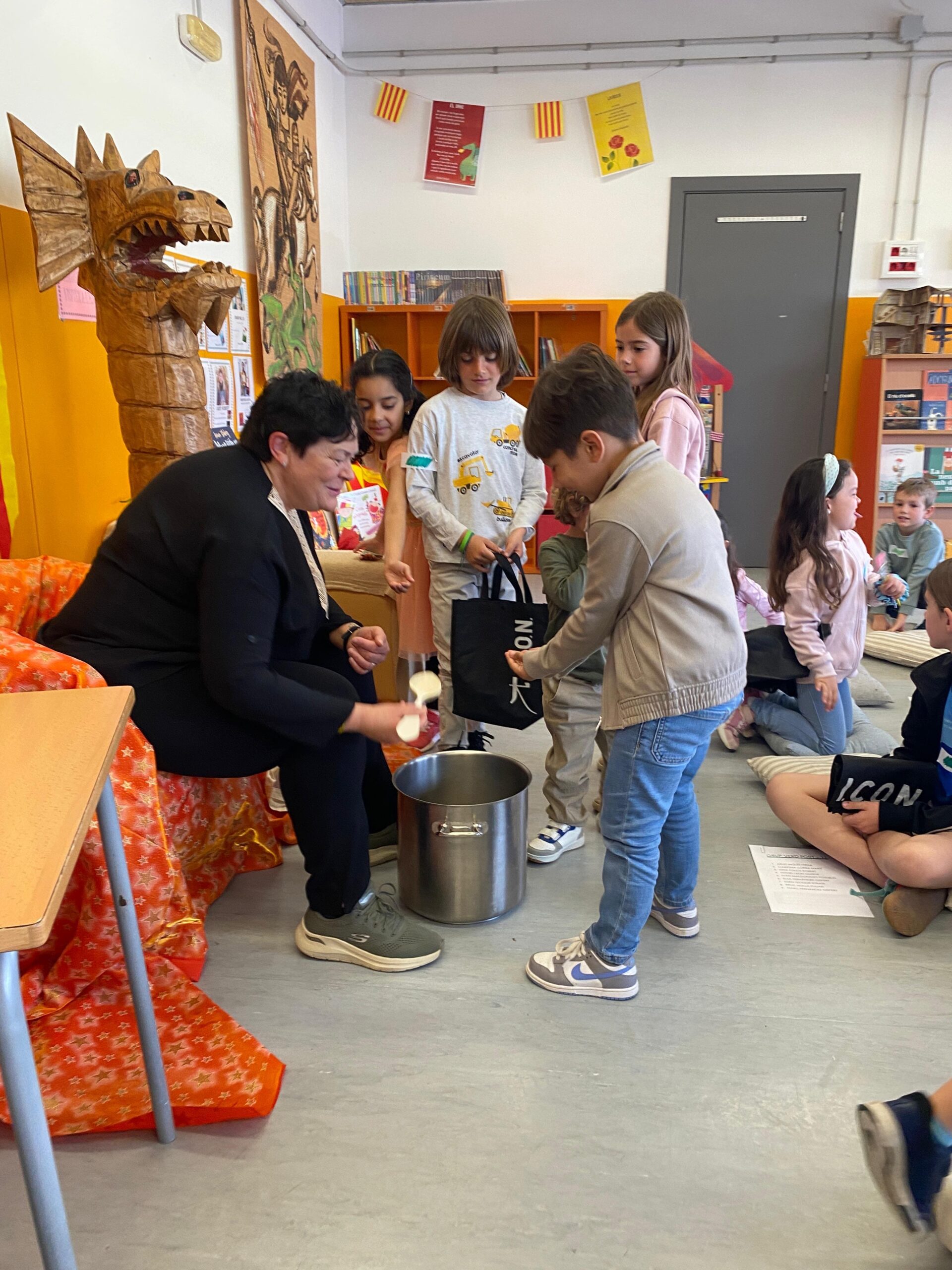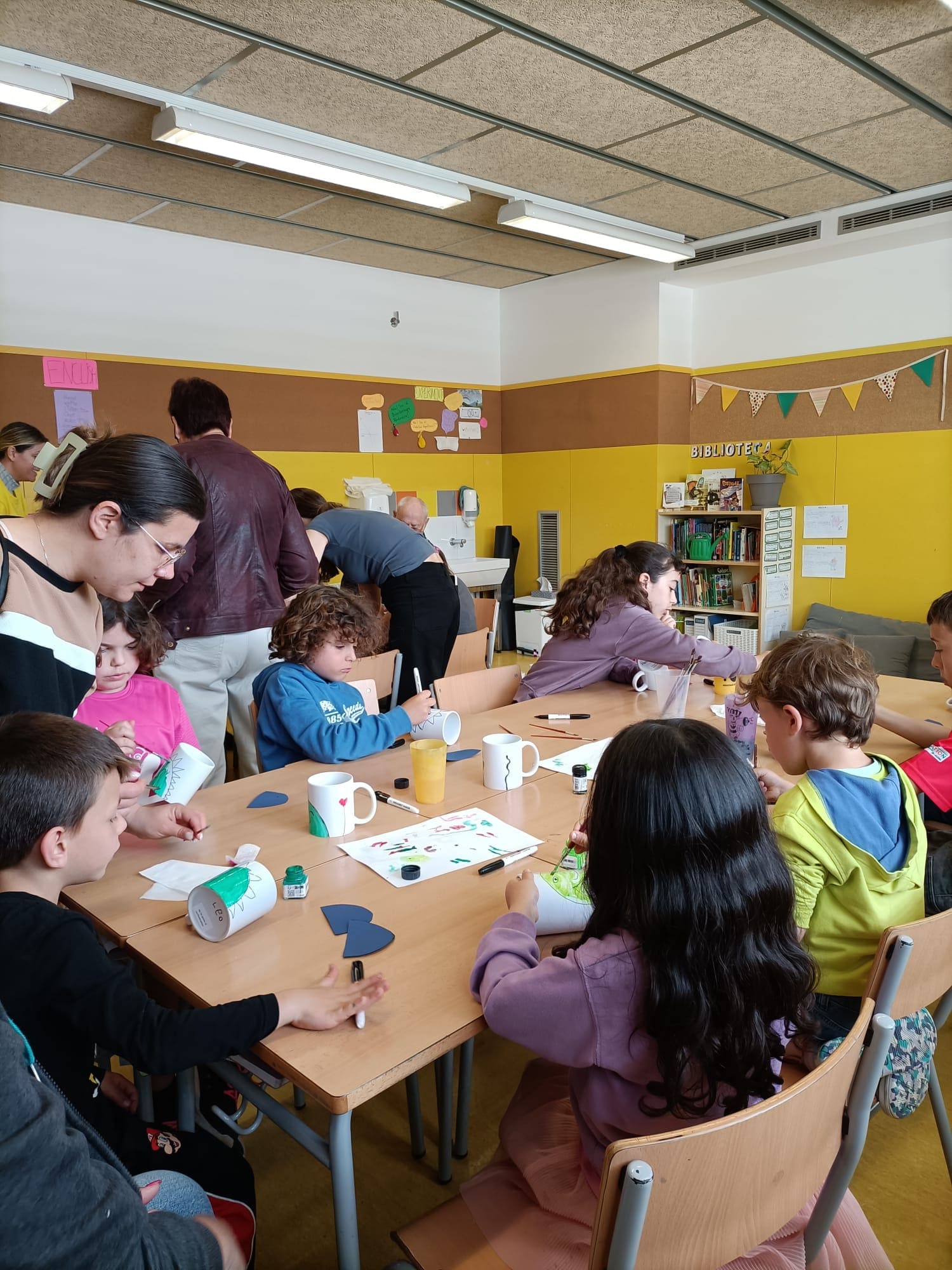 Els tallers van ser: jugar al bingo caterí, pintar una tassa, fer una xapa, ballar el ball de gitanes, escoltar contes (explicats per familiars i el Selvi!) i mirar un vídeo de Sant Jordi.