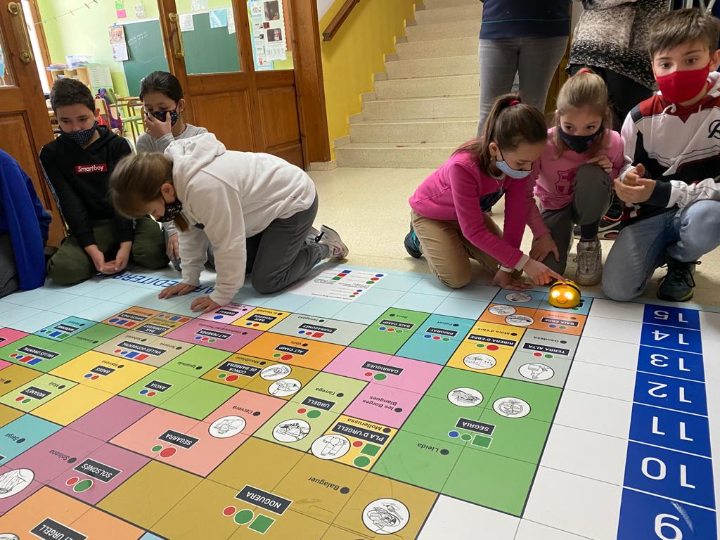 Era mainadèra de cicle iniciau, ei en tot trabalhar era orientacion espaciau damb eth robot bee bot e er escolanat de cicle miei ei estudiant es comarques dera nòsta comunitat e es sectors economics. Per aquest motiu, auem aprofitat eth materiau deth projècte FER entà qu’es alumnes de prumèr e dusau elaborèssen rèptes tàs escolans e escolanes de tresau e quatau entà qu’eth robot se botgèsse pes diuèrsi parçans de Catalunya.