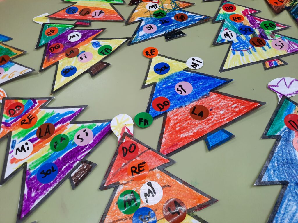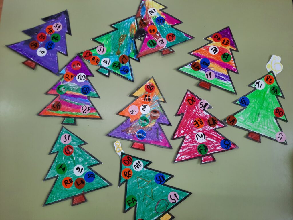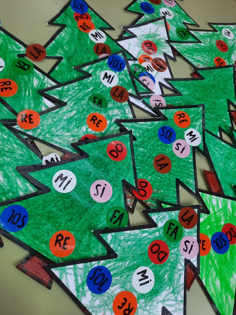 Al llarg d’aquest primer trimestre, hem cantat i ballat les notes musicals ben fort: DOO, REE… i, hem après l’escala amb la cançó: Les notes de Pentagrama. Els arbres han estat la forma de cantar-les en un entorn nadalenc. Ens faltaria la senyora Clau de Sol 𝄞 a dalt de l’arbre?