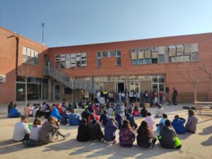 L’alumnat de 6è va llegir un manifest en favor de la pau. Després els nens i nenes de tots els cursos van anar desmuntant un mur format per paraules contràries a la pau, per descobrir un gran colom que ens recordava què és la pau.