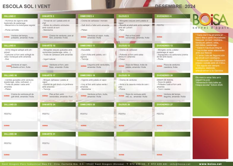 Us adjuntem el menú del mes de desembre.