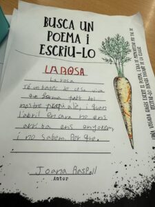 Dia mundial de la poesia (5è) admin24/03/25 Avui, Dia Mundial de la Poesia, hem gaudit recitant poemes amb els alumnes de 5è A! A més, hem aprofundit en la part formal de la poesia: rima, mètrica i estructures. Tot un viatge ple de creativitat i aprenentatge!