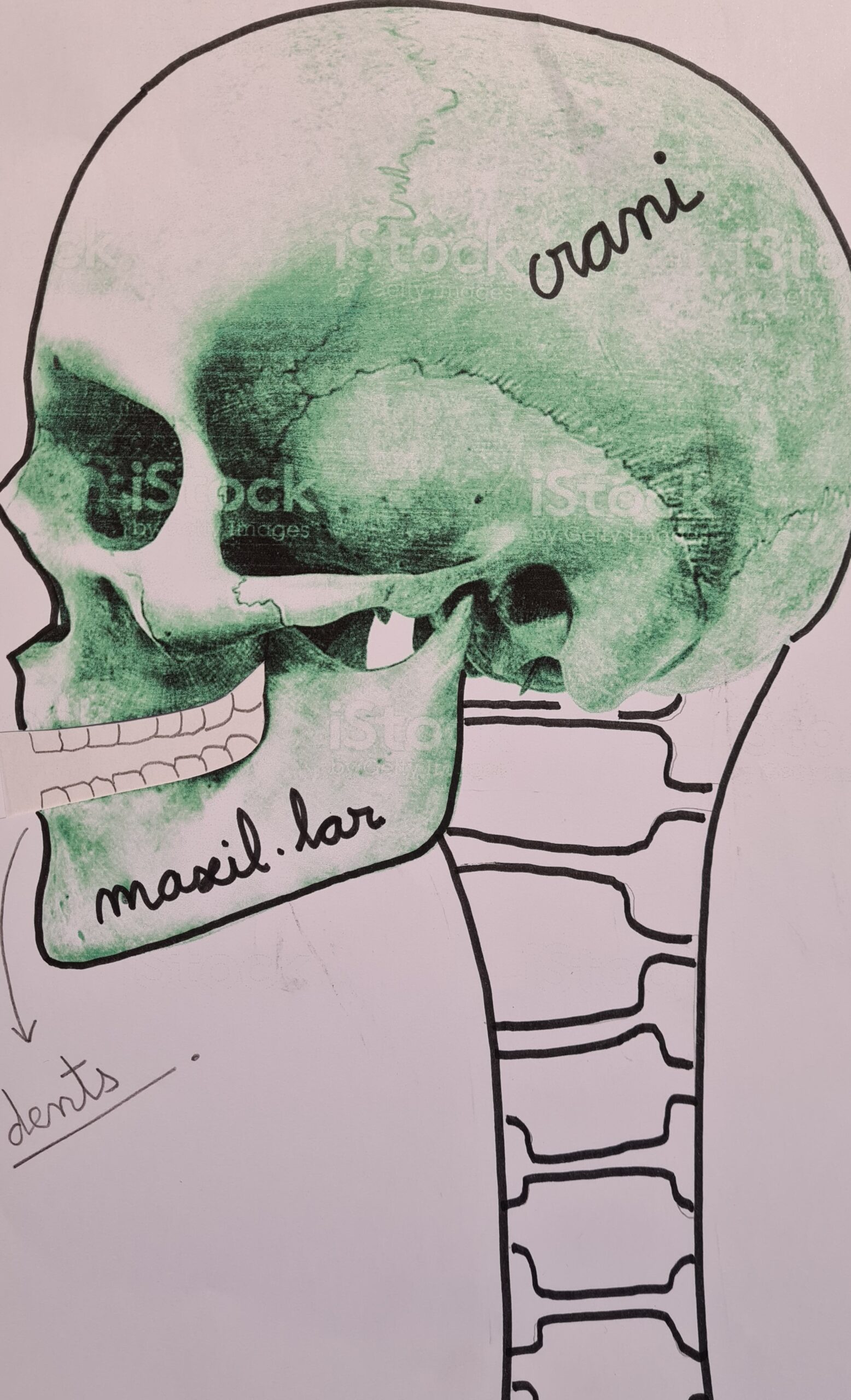 MEDI: ens centrarem en els ossos de la cara! Concretament el crani i els maxil·lars. Amb retolador resseguirem el contorn del cap ossi tot marcant el nom d’aquests dos ossos. També dibuixarem les dents i les vèrtebres cervicals que se situen en el coll. Us adjunto un document a partir del qual podeu realitzar aquesta activitat!