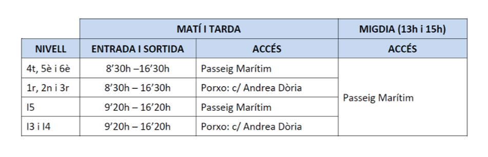 Les entrades i sortides de l’alumnat es faran de la següent manera: