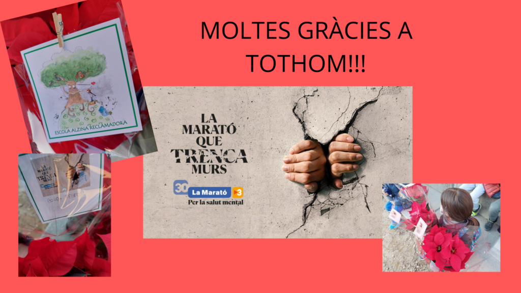 L’ALZINA AMB LA MARATÓ DE TV3 Clara Shumann29/12/21 EL PASSAT 19 DE DESEMBRE ES VA CELEBRAR LA MARATÓ DE TV3 PER LA SALUT MENTAL. LA NOSTRA ESCOLA TAMBÉ HI HI PARTICIPAT I GRÀCIES A LA COL·LABORACIÓ DE MOLTES FAMÍLIES, MESTRES, MONITORES, AMICS, AMIGUES… HI HEM POGUT APORTAR 225€.