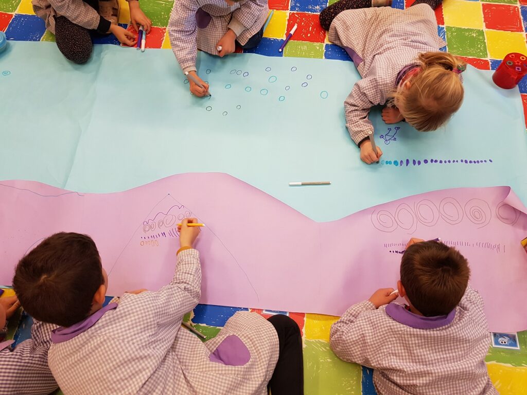 A part d’escoltar-la i diferenciar els sons llargs (legato) i curts pinçats (pizzicato) que fan els violins, mentre hem fet una escolta activa, hem creat un paisatge d’hivern amb grafisme creatiu.