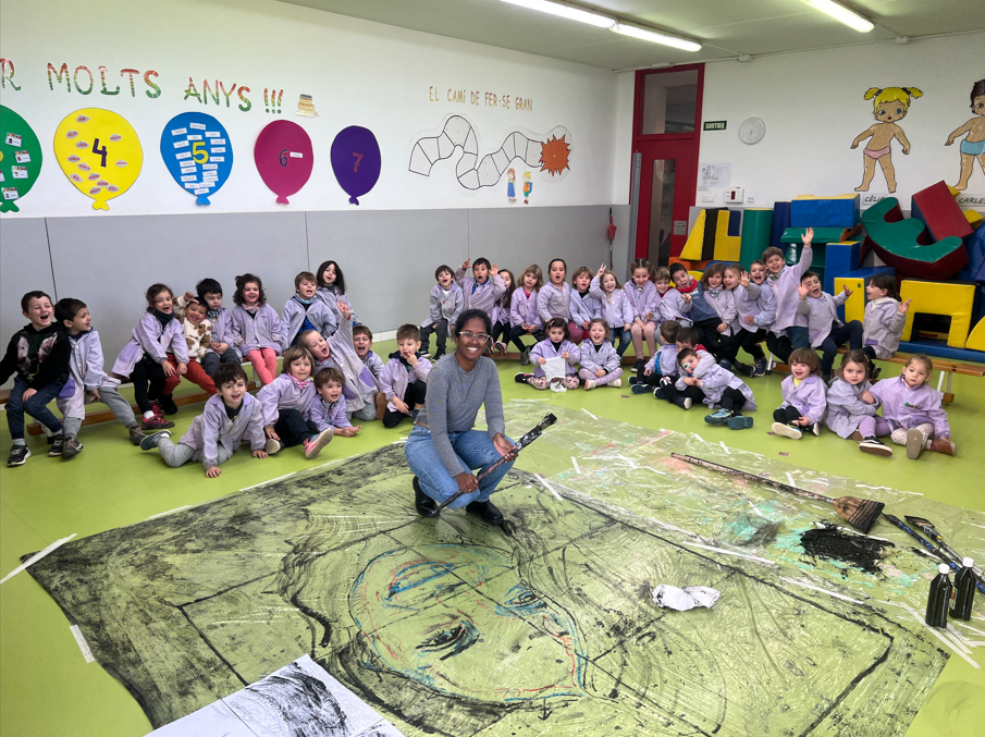 Primer vam tenir la sort de tenir a l’escola l’ajudant de la Lídia, la Sara Bartra, que ens va ensenyar la tècnica de l’artista i ens va deixar provar uns pinzells gegants creats amb escombres i un esborrador molt original, un pal de fregar!