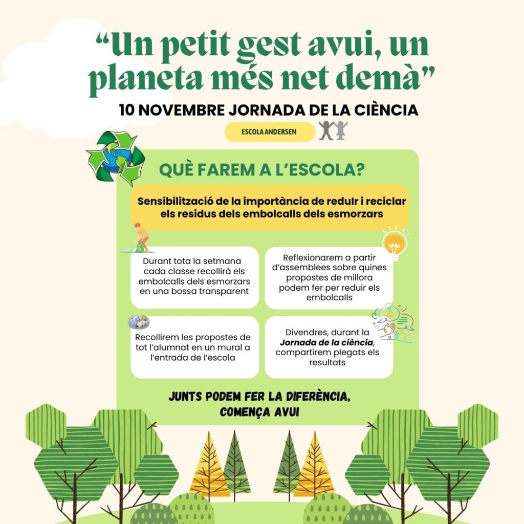 Durant tota la setmana farem una campanya de sensibilització sobre la importància de reduir i reciclar els embolcalls dels esmorzars. Cada dia, cada classe guardarà els embolcalls de l’esmorzar en una bossa transparent al llarg de tota la setmana i divendres a les 11h ens trobarem tots plegats al pati per compartir les nostres propostes de millora i reflexions al voltant d’aquest tema. Paral·lelament, avui hem començat a gestionar una comissió de neteja composta per alumnat de tots els cursos de primària on cada nivell és el responsable de mantenir net un espai de l’escola. Entre tots i totes cuidem la nostra escola.