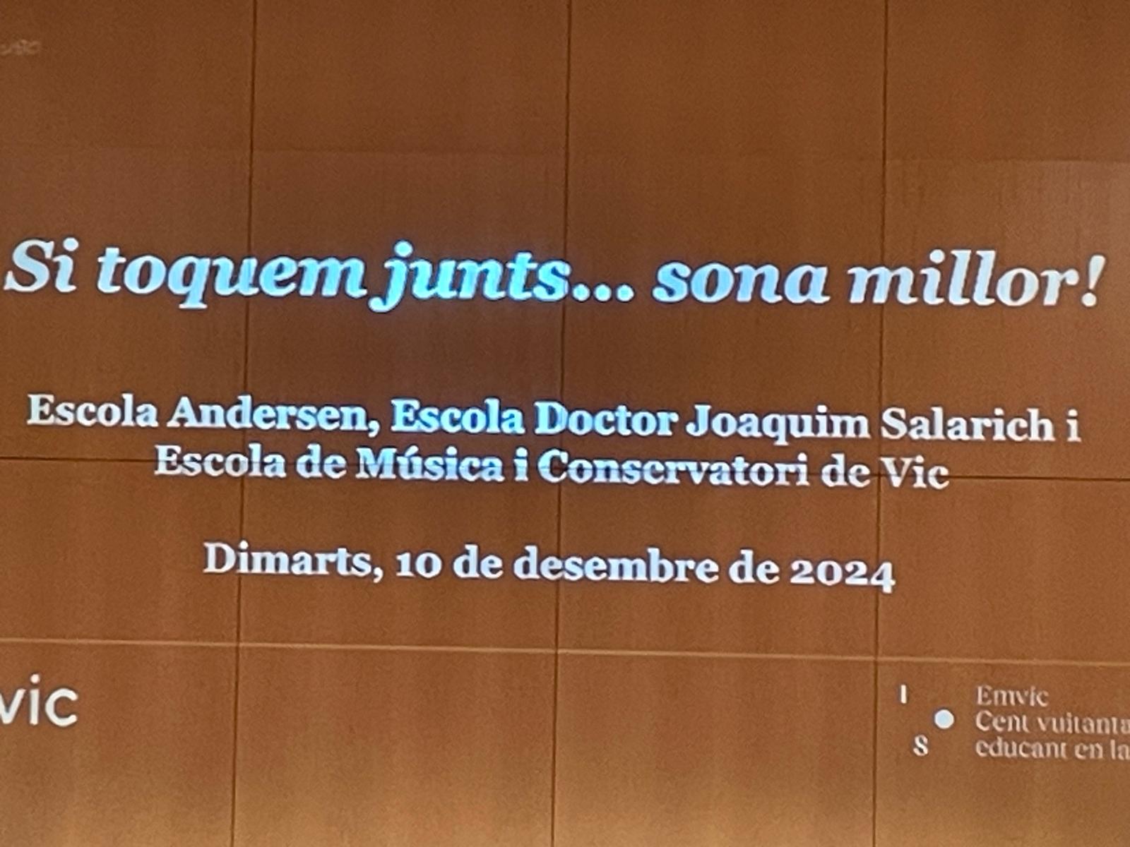 Si toquem junts…sona millor, és un programa on l’alumnat de 3r de l’escola assisteix durant un trimestre amb els seus mestres de música i en horari lectiu, a tallers setmanals a l’Escola de Música de Vic per treballar diferents disciplines musicals. Enguany hem compartit l’experiència amb l’alumnat de 3r de l’escola Salarich.