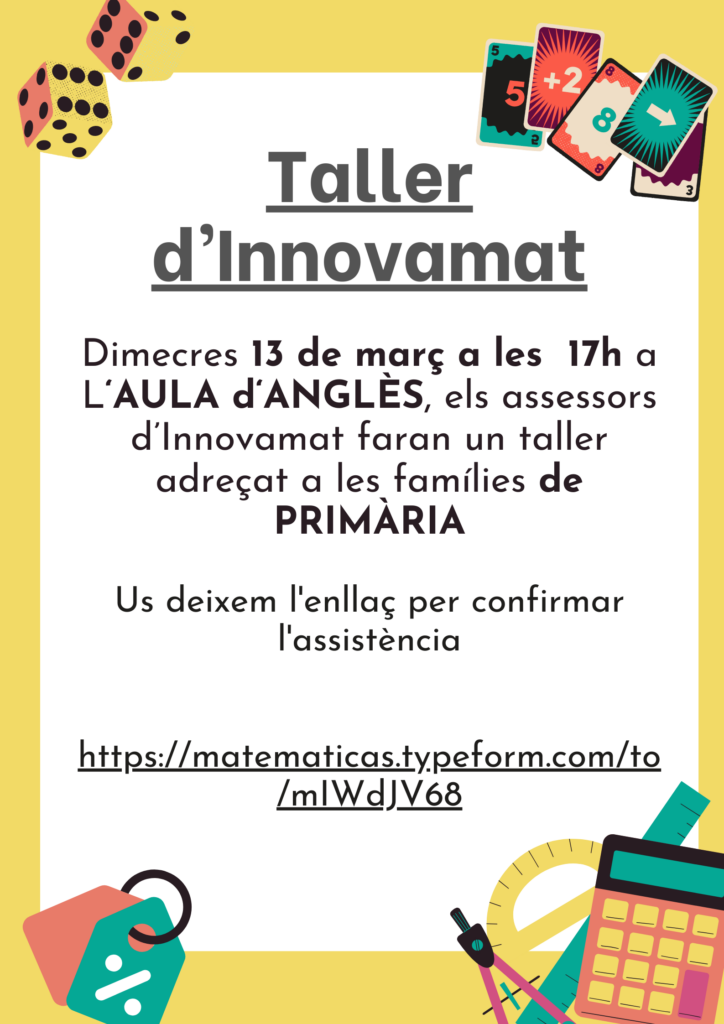 El proper dimecres dia 13 de març a les 17h a l’aula d’anglès de l’escola s’oferirà un taller on assessors d’Innovamat ens explicaran com es treballen les matemàtiques. Us hi esperem!