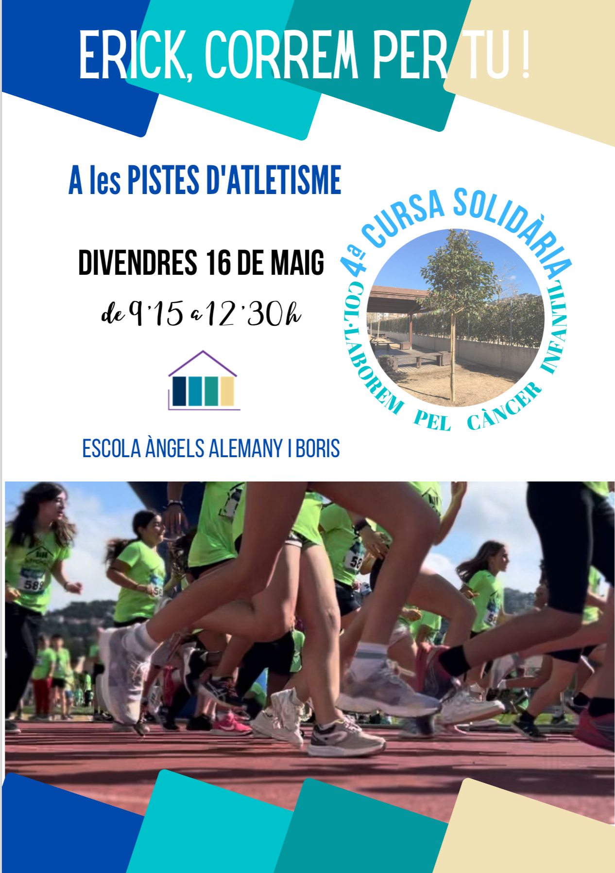 El proper divendres 16 de maig, l’Escola Àngels Alemany i Boris celebrarà la 4a Cursa Solidària a les pistes d’atletisme, sota el lema “Erick, correm per tu!”.