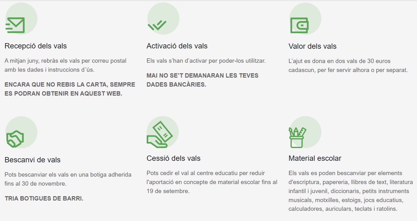Cliqueu a l’ENLLAÇ per a accedir a tota la informació. Teniu accés a les instruccions per a bescanviar el val escolar així com un cercador per a buscar els establiments adherits.