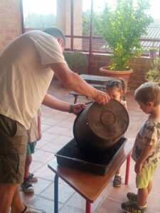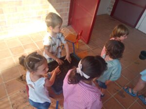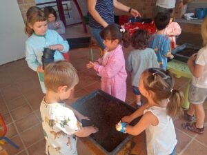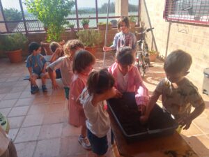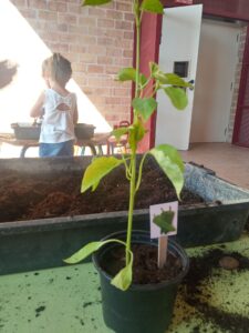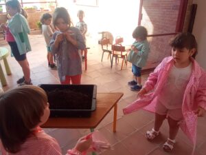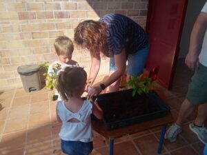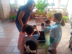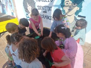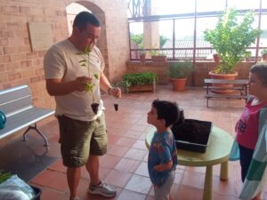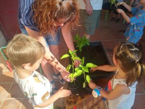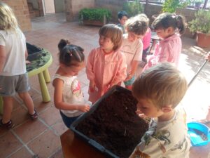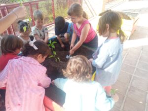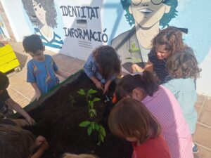 Després hem procedit a fer d’horticultors, hem observat el planter (planta original d’on surt després l’hortalissa), en aquest cas eren de tomàquets i de pebrots; hem tocat i experimentat amb la terra, hem posat aquesta en un test i hi hem col·locat la planteta de tomaquera i de pebrotera.