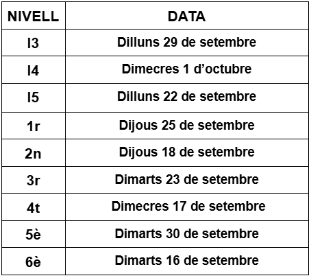DATES REUNIONS FAMÍLIES CURS 25-26 Feu un comentari / Per admin / 05/09/2025 / CURS 2025/2026 Infantil Portada Primària / reunions És important la vostra assistència de cara a un bon funcionament del curs. Totes les reunions seran a les 17h.