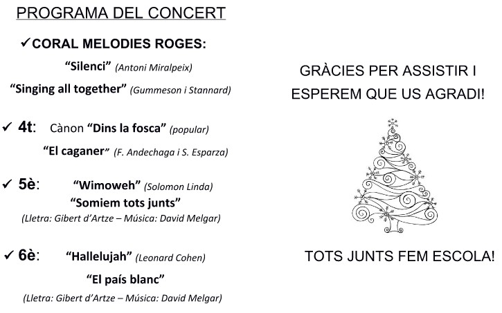 Aquí teniu les dates dels concerts de nadal. Tindran lloc al gimnàs de l’escola a partir de les 15h. Us