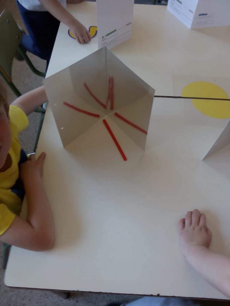 Els nens i nenes de P4 experimentem el fenomen de la reflexió de la llum jugant. Emmirallant-se en un full platejat i col·locant al davant diferents objectes per veure com queden reflectits. Aprofitem també per treballar les simetries. S’ho han passat molt bé!