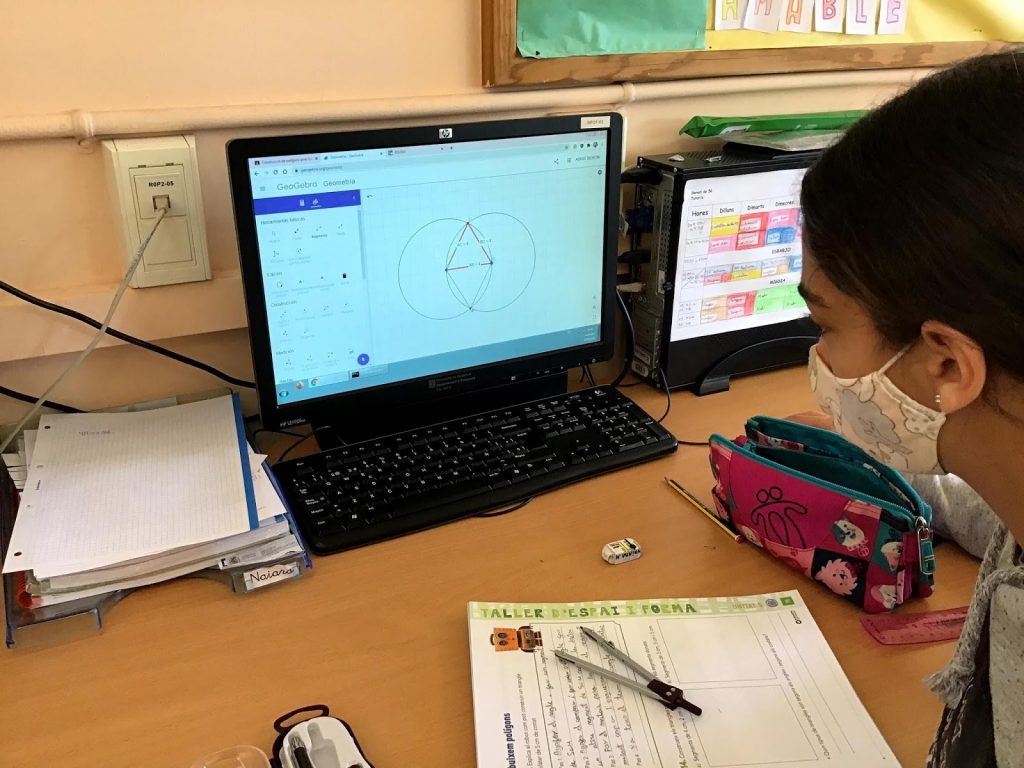Geogebra és una software que permet treballar continguts de matemàtiques amb l’ordinador. Els alumnes de cinquè han començat a dibuixar polígons, concretament triangles, amb el mòdul de geometria d’aquesta aplicació. Amb l’ajut de les diferents eines que ofereix el programari estan construït triangles de costats determinats.