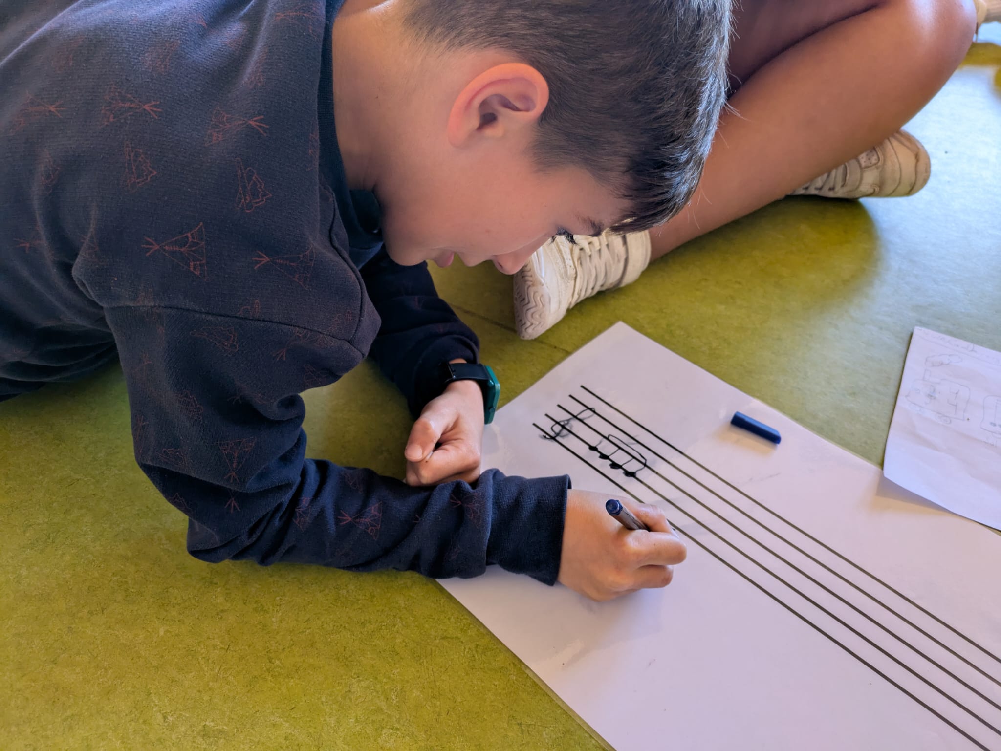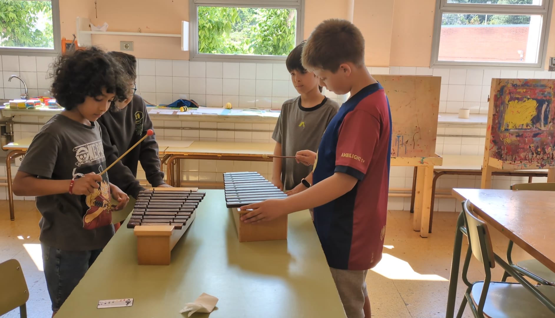 Per fer-ho, en primer lloc, hem creat patrons rítmics i, posteriorment, els hem posat notes. D’aquesta manera hem practicat l’escriptora musical al pentagrama. I una vegada les composicions ja estaven fetes, ha arribat el moment d’interpretar-les amb instruments de percussió com per exemple els boomwhakers o els xilòfons.