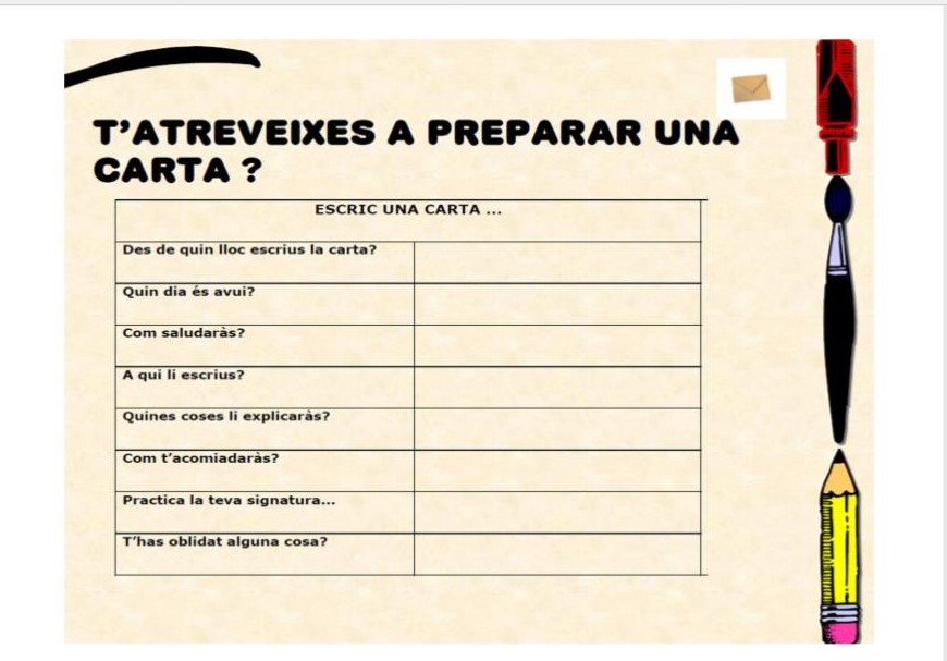 AQUEST DIES QUE ESTEM A CASA FENT MOLTES COSES TAMBÉ PODEM APROFITAR A FER UNA CARTA A LES COMPANYES I ELS COMPANYS DE GRUP. A CONTINUACIÓ TENIU UNA PLANTILLA QUE US POT AJUDAR A FER-LA. SEGUR QUE US SURTEN MOLT BÉ I ORIGINALS !!