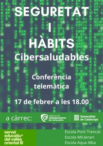 Des del Centre de Recursos Pedagògics (CRP), han organitzat per les famílies de diferents escoles de la zona una conferència telemàtica de “Seguretat i hàbits cibersaludables”, que tindrà lloc a través de la plataforma Meet el proper dia 17 de febrer a les 18.00h. a càrrec de l’Agència de ciberseguretat de Catalunya