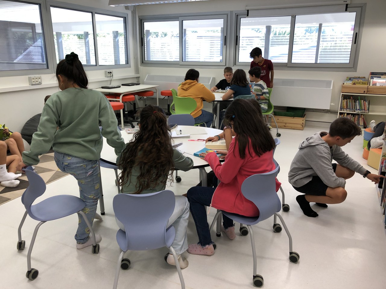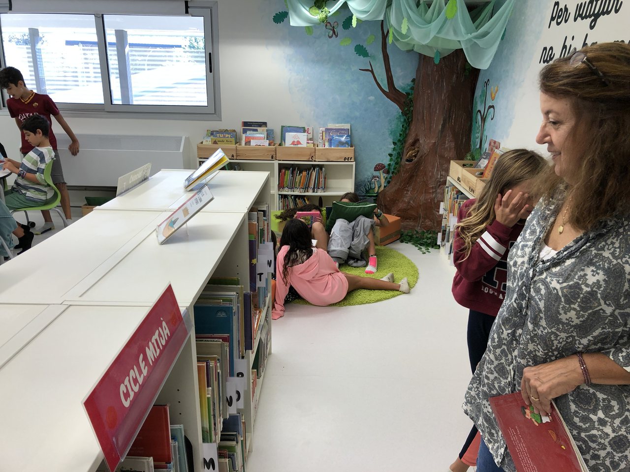 Aquest és un projecte d’escola que es va haver d’aturar durant la pandèmia. Consisteix a que durant l’horari d’esbarjo de dimarts i dimecres, l’alumnat de primària que fa el pati dins el recinte escolar podrà pujar a fer ús de la biblioteca per a fer lectura i préstec, o devolució, de préstecs de material de la biblioteca. També poden utilitzar els sofàs de la terrassa per a lectura o per xerrar tranquil·lament.